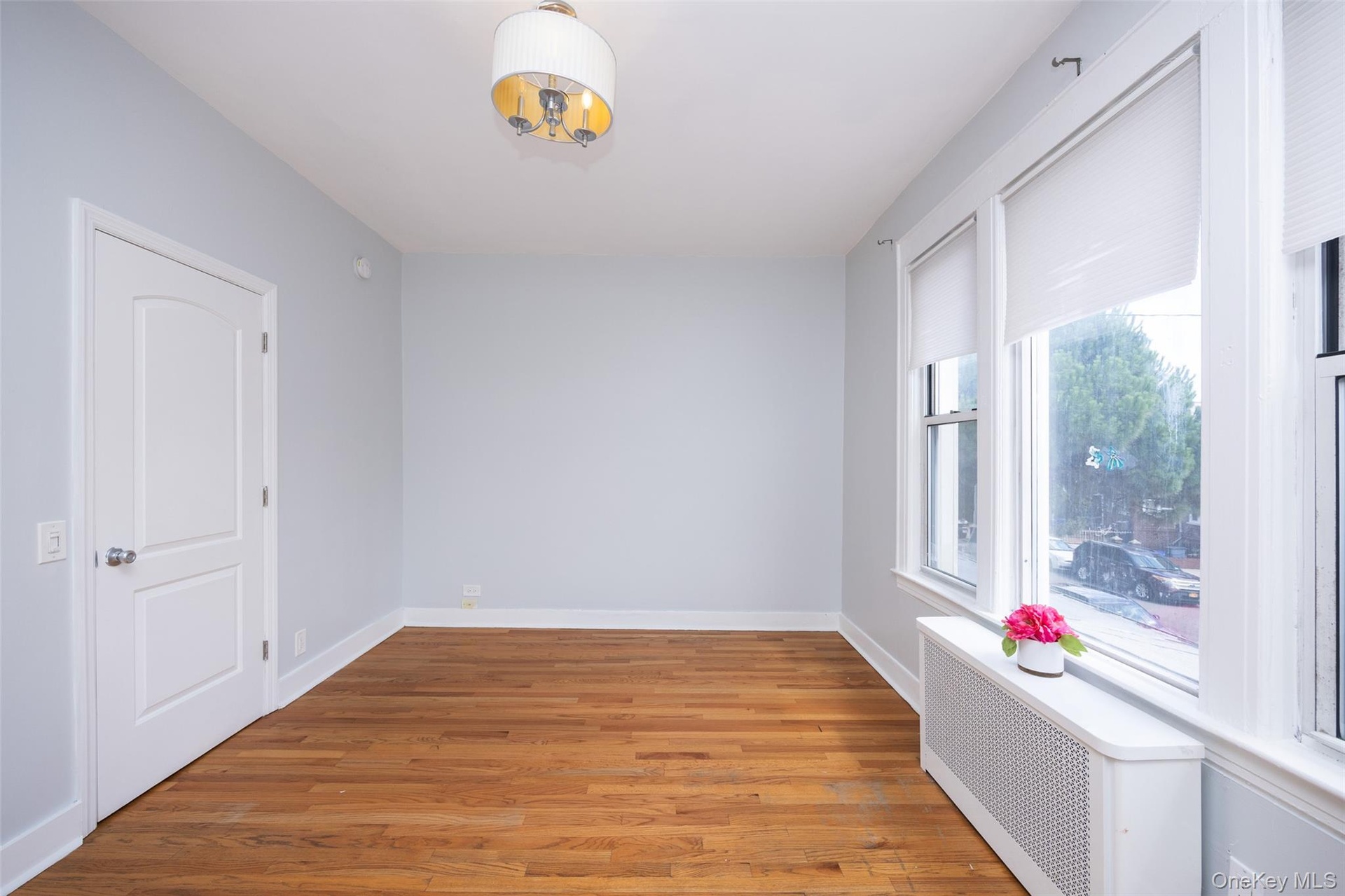 - Empty room with radiator heating unit, wood finished floors, and a wall mounted AC