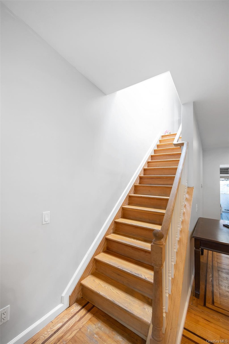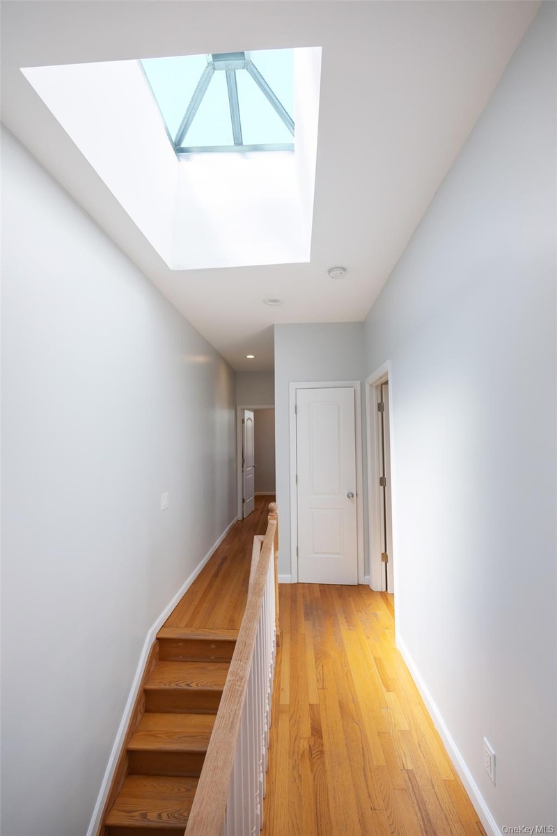 - Hallway featuring light wood finished floors, an upstairs landing, and a skylight