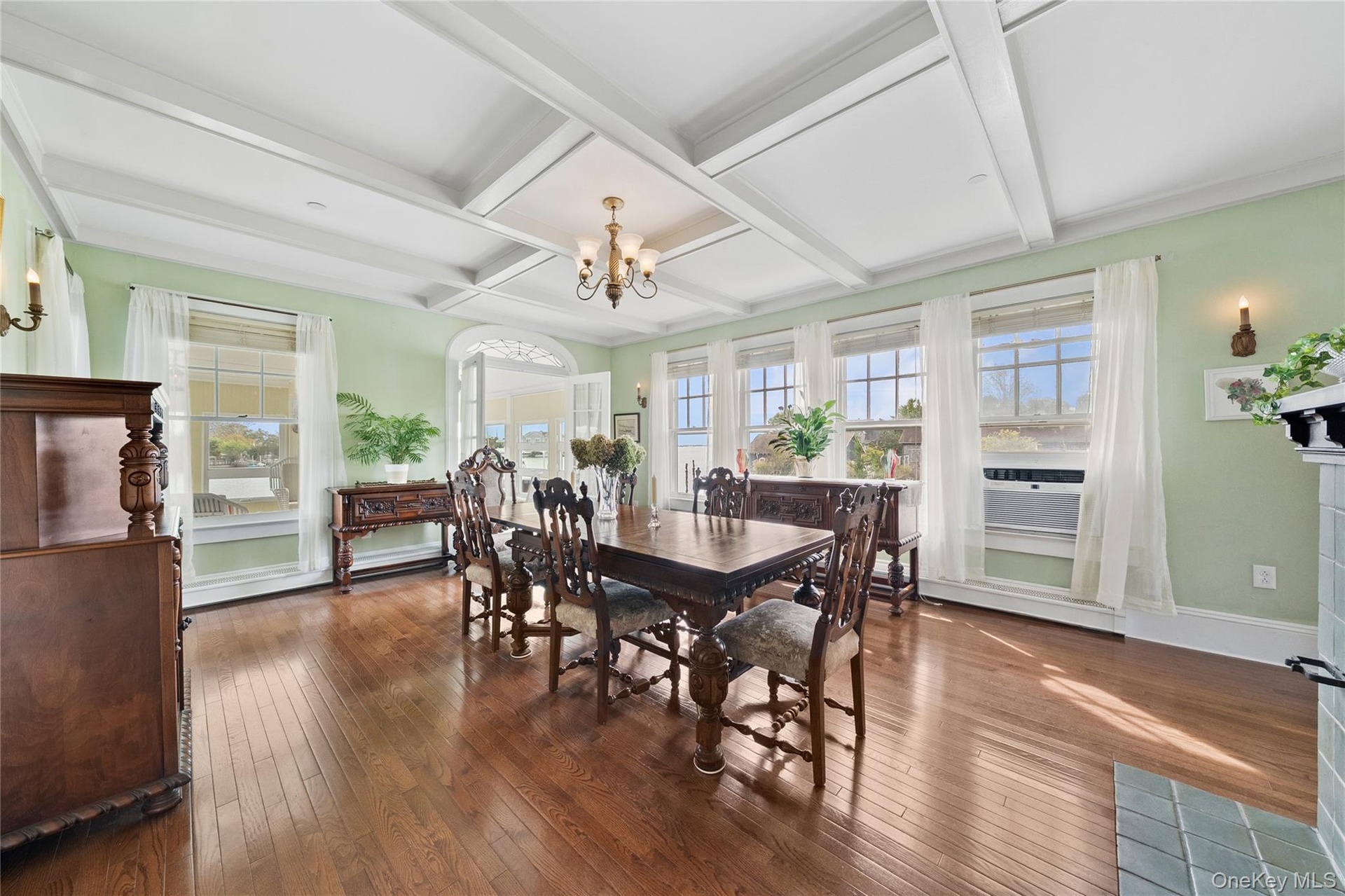 - Dining area with a chandelier, beamed ceiling, coffered ceiling, a fireplace, and hardwood / wood-style flooring