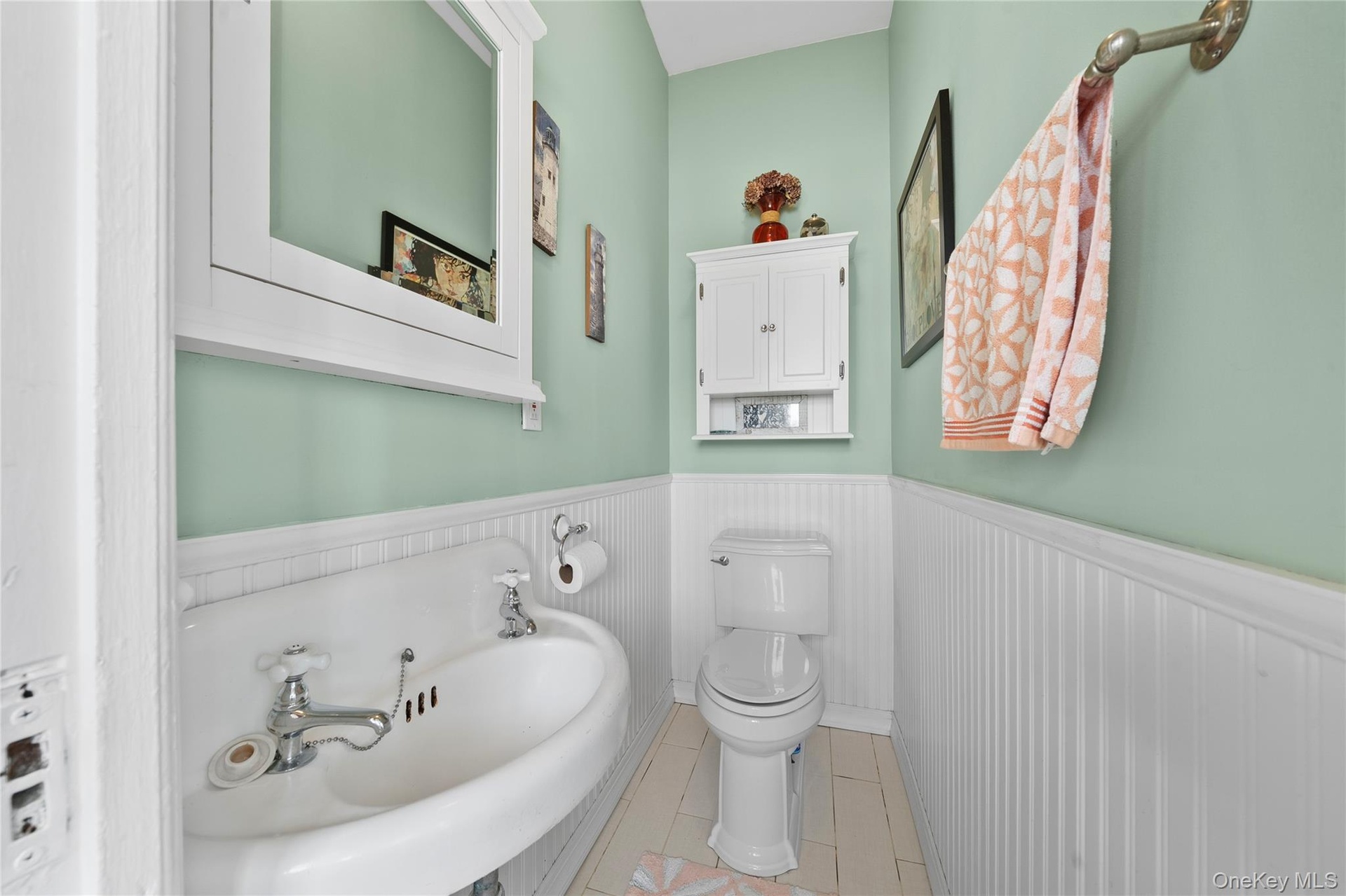 - Bathroom with a wainscoted wall and light tile patterned flooring