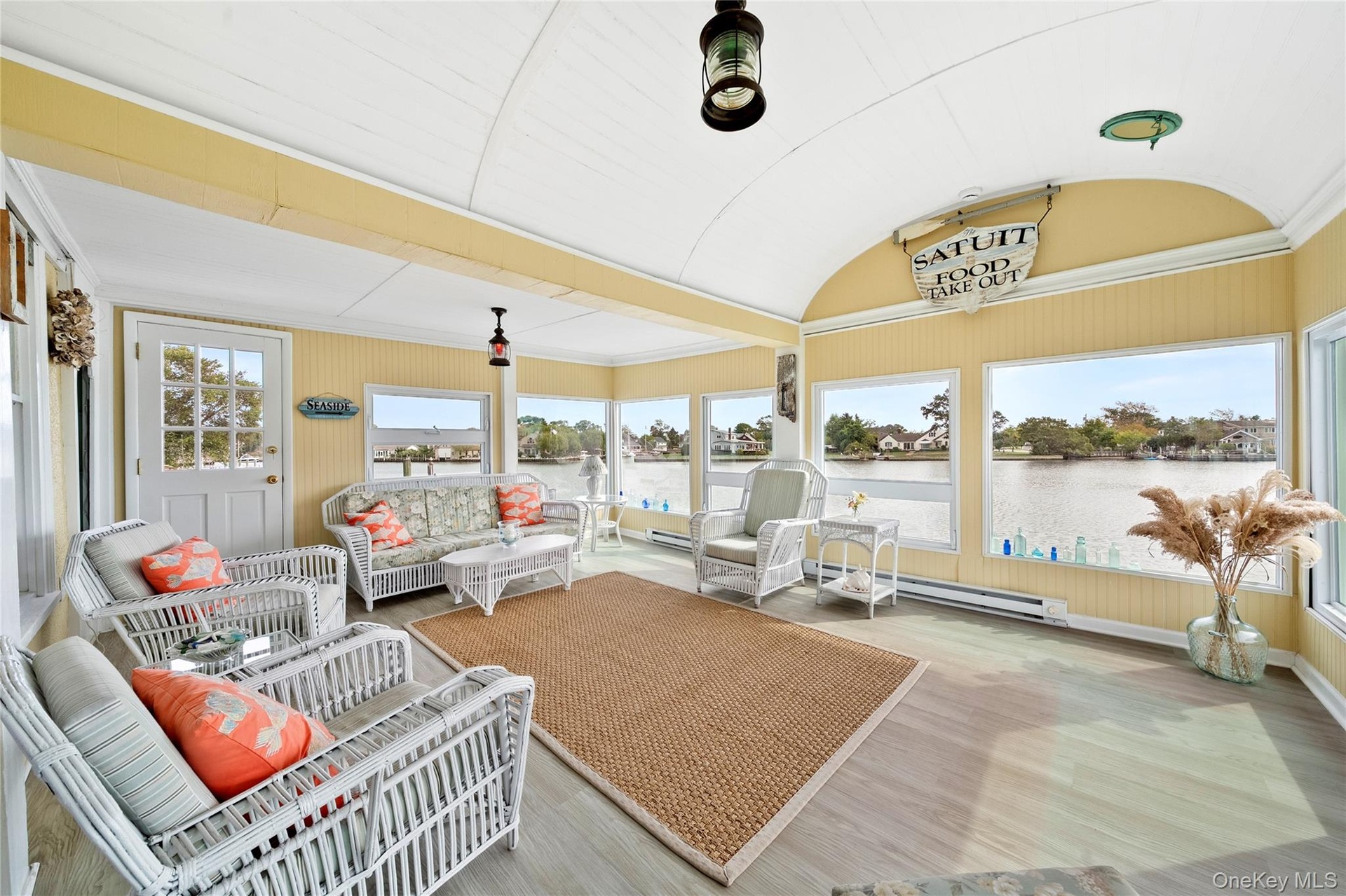 - Sunroom with lofted ceiling, wood finished floors, a water view, a baseboard heating unit, and ornamental molding