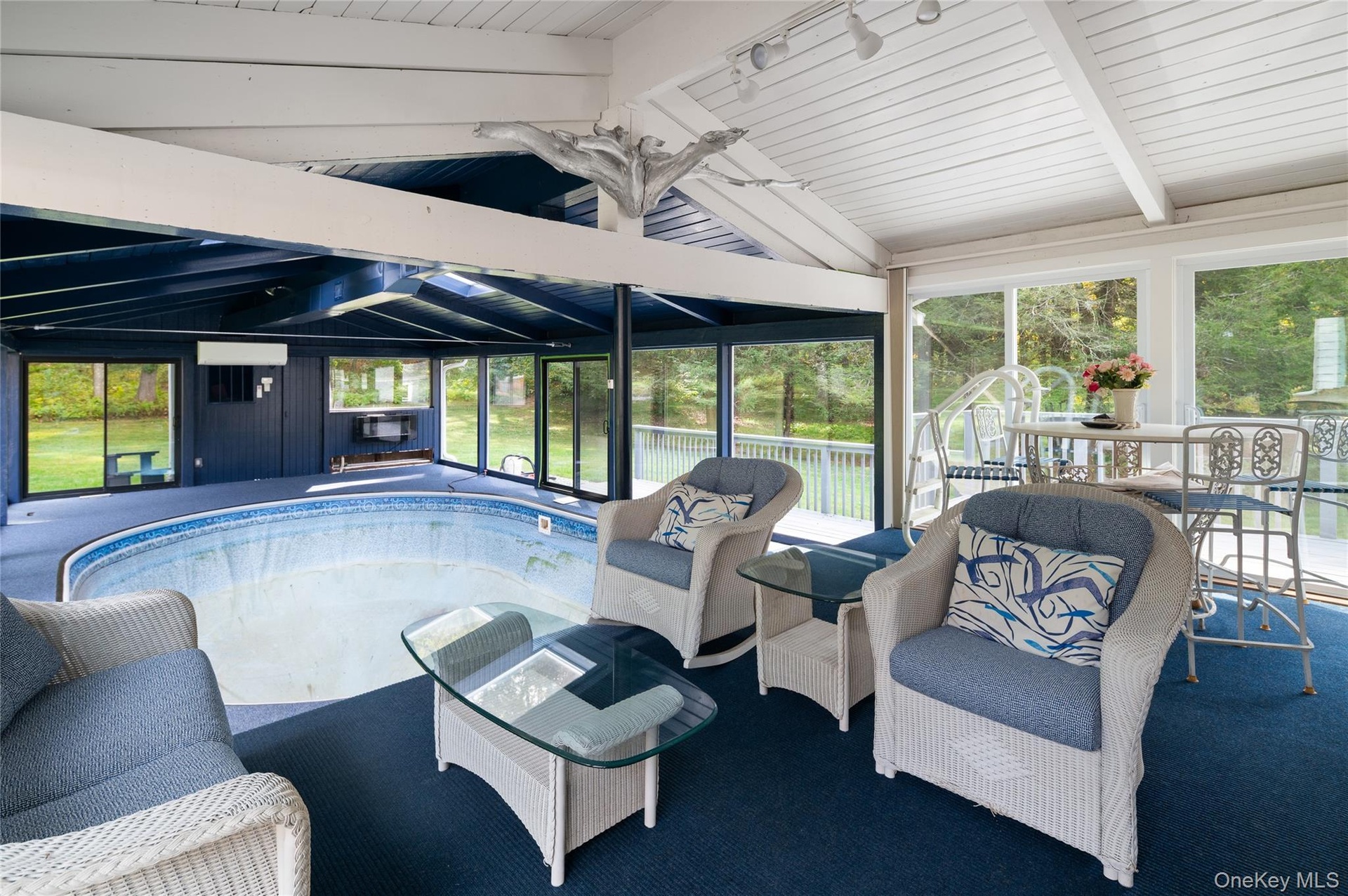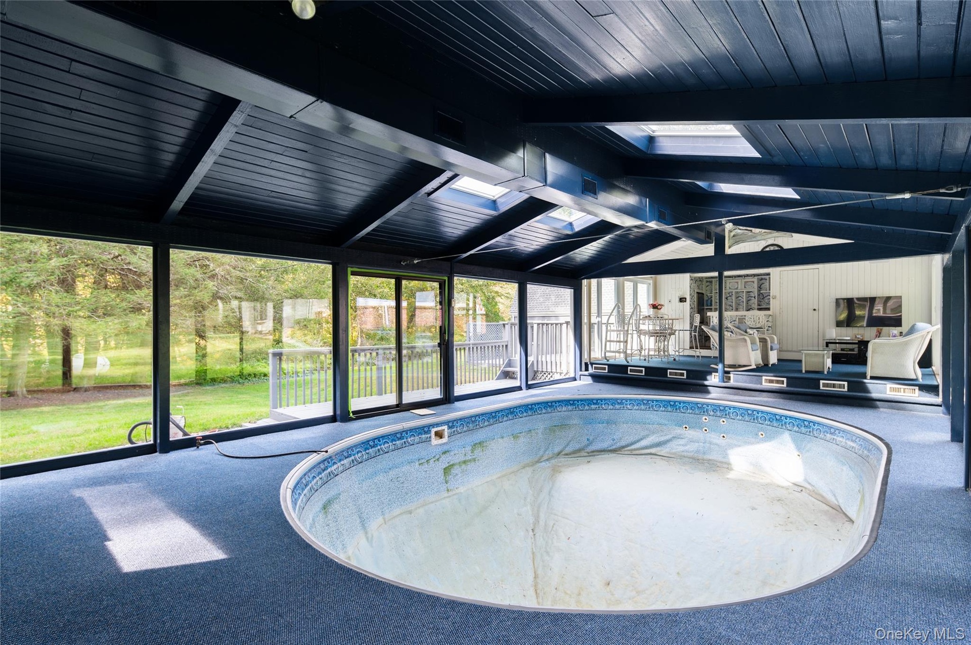 - Swimming pool featuring walls of windows, skylight, and ductless AC lounge area, sauna and bath