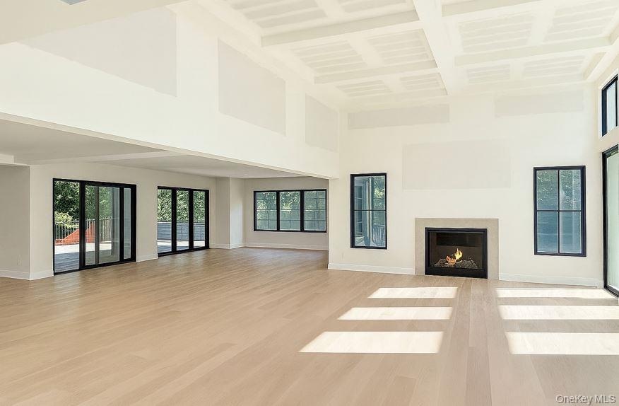 - Unfurnished living room with light wood-style flooring, a lit fireplace, plenty of natural light, beamed ceiling, and a high ceiling
