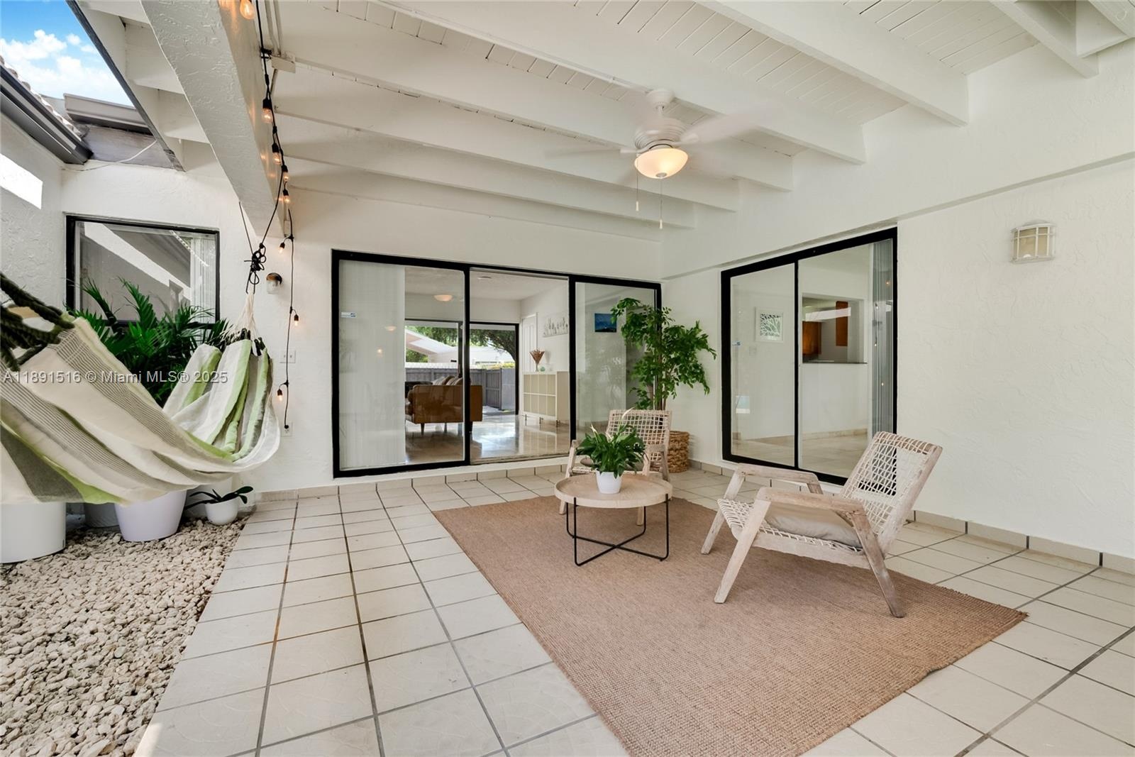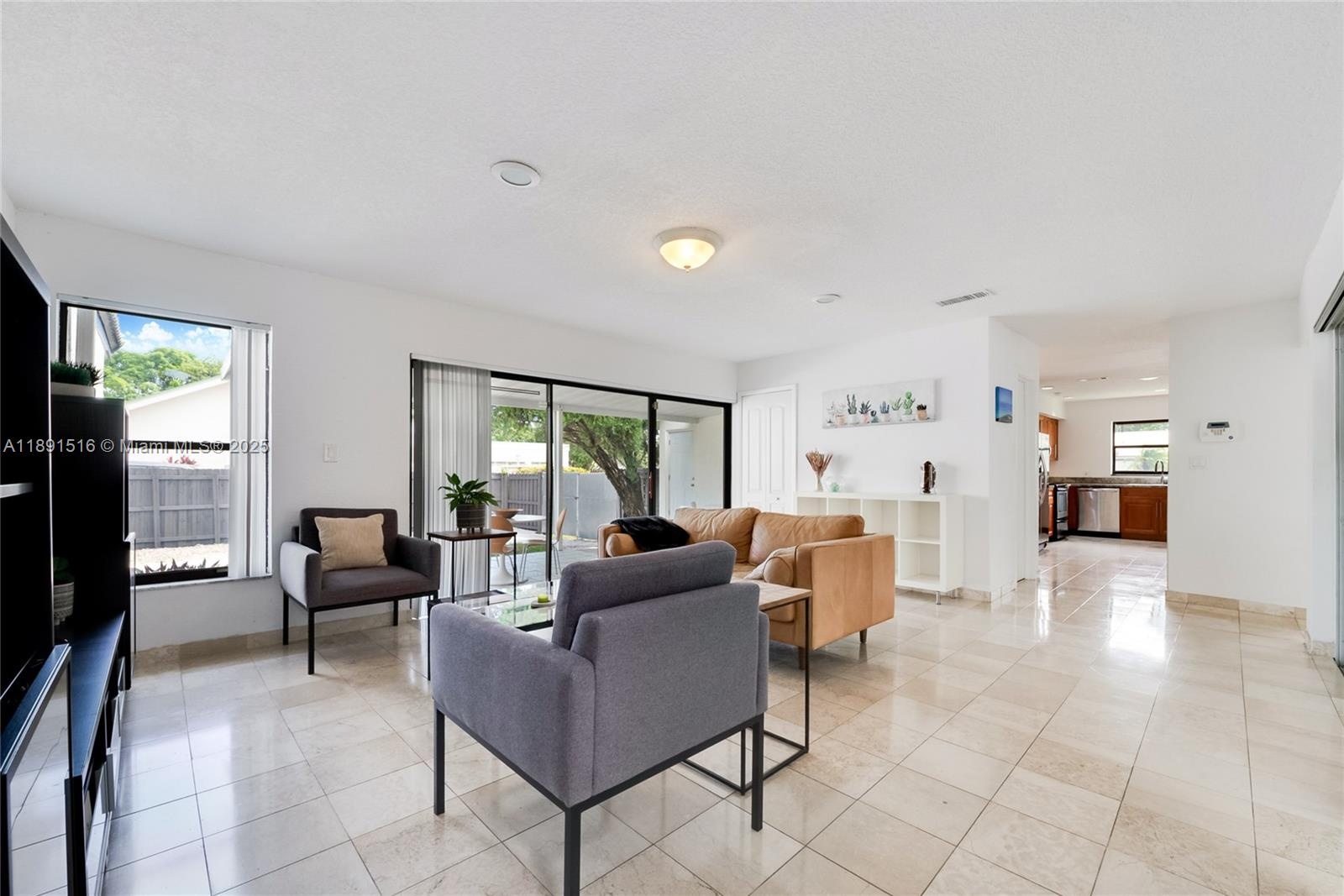 - Living room with high ceilings and abundant natural light, offering direct access to the large patio and a private front terrace. Split Floorplan.