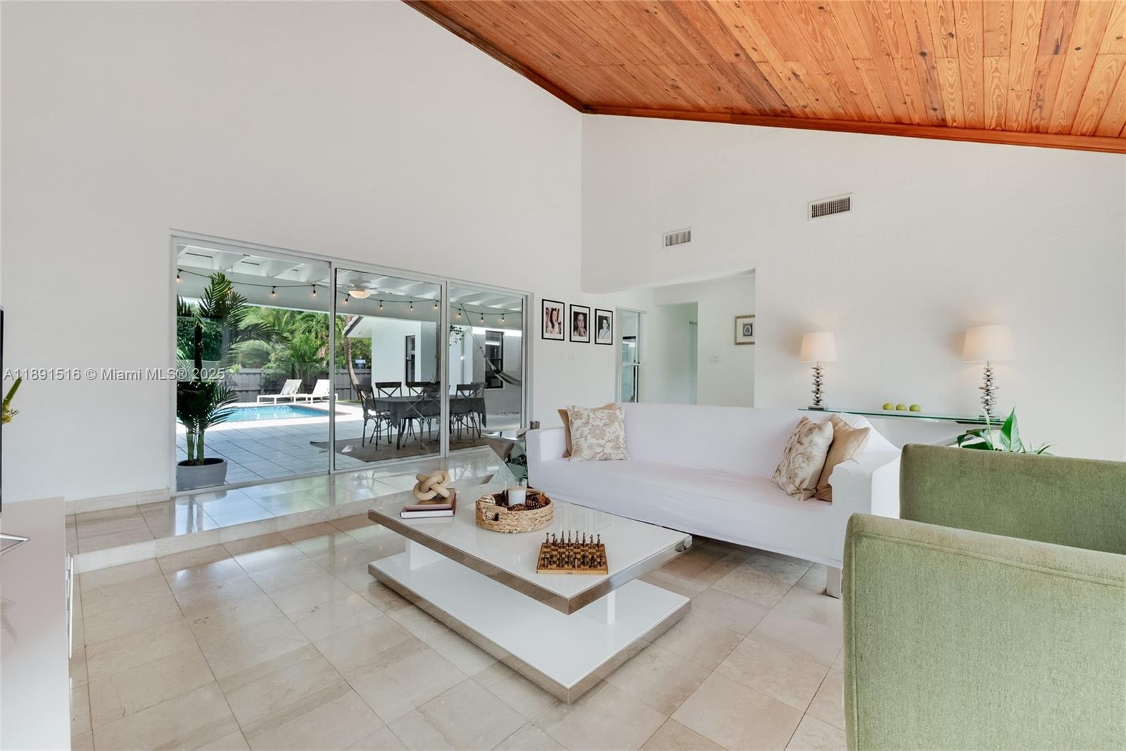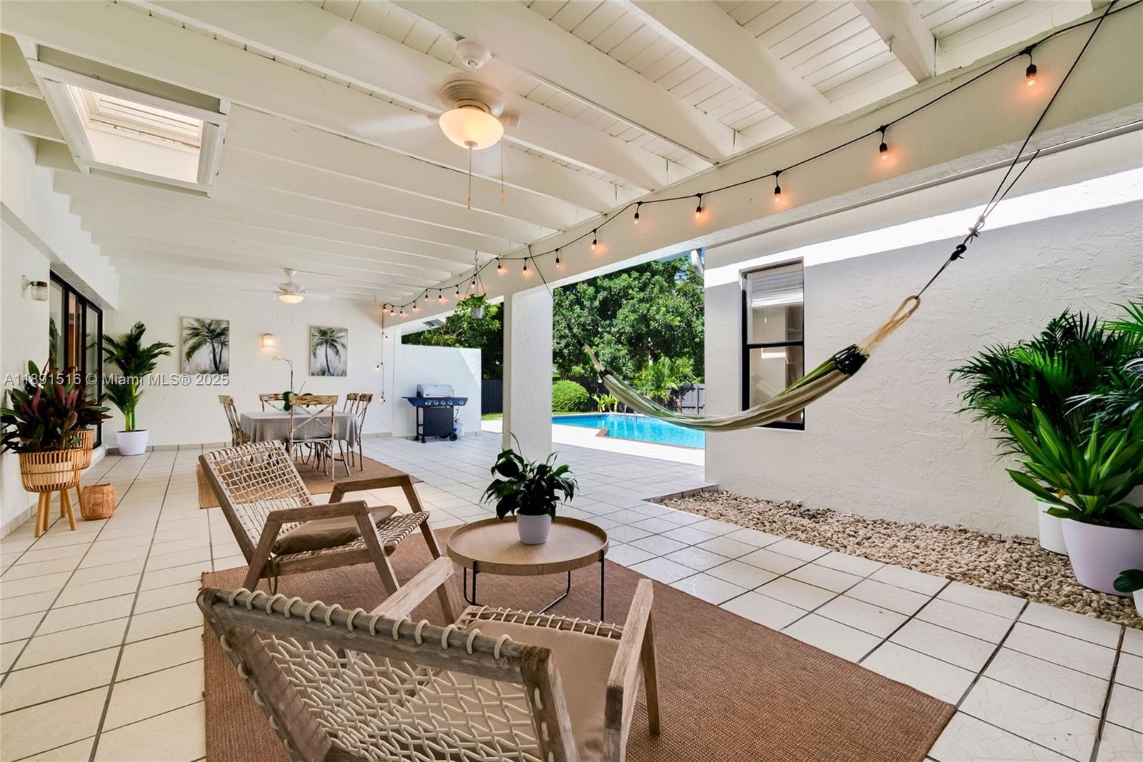 - Family or dining room with large sliding doors on both sides, opening to the covered patio and a private second terrace — filled with natural light th