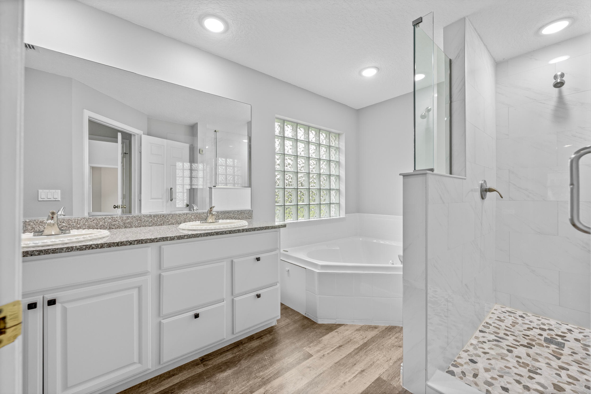 Don't miss your chance to live in spacious a 5 bedroom 3.5 bath located in the HIGHLY sought after neighborhood: Summerfield! This property is equipped with new vinyl flooring throughout, fresh interior paint, and the back patio of your dreams! Additional features include SpeedQueen washer/dryer, 2024 downstairs AC, 2021 water heater, gutters, and FULL storm protection! Primary bedroom with spa like bathroom is tucked away on ground floor. Kitchen is equipped with 2021 stainless appliances, tile backsplash, and granite countertops. Bonus: this home also has a central vacuum for easy cleaning! All security cameras and alarm systems convey! Move in ready!