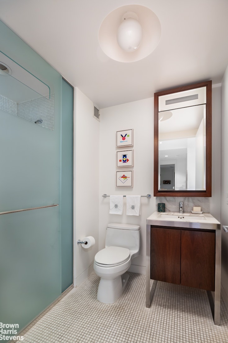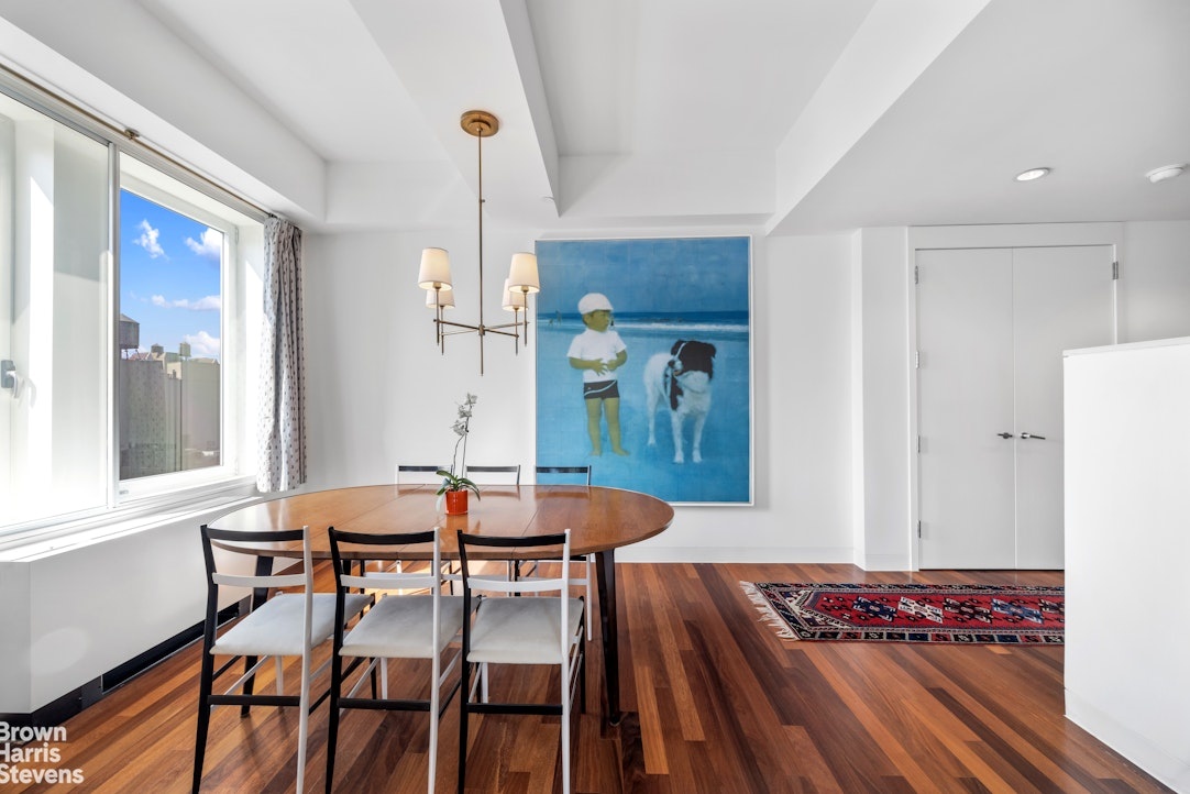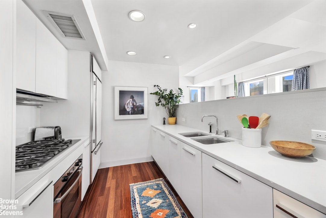 The expansive layout begins with a grand entrance foyer, anchored by ample closet space, a laundry room with vented washer-dryer, and a full bathroom with steam shower. The open corner living-dining-den area has private media and/or guest room nook and kitchen area measuring a total of 27' by 27'. The semi-open kitchen, with oversized pantry closet added, is outfitted with custom cabinetry, quartz countertops, and top-tier appliances, including a 36" Viking Professional Series range with a vented hood, a Bosch dishwasher, and a Sub-Zero refrigerator. The floors are wide-plank Brazilian hardwood in impeccable condition. The residence is pin-drop quiet with double pane windows and extra soundproofing by Citiquiet windows. The generously proportioned primary suite is a luxurious retreat, featuring an en-suite bath with separate steam shower and bath as well as multiple large and walk-in closets all customized for maximum storage and efficiency. The second bedroom, also with its own en-suite bath and ample closets, offers comfort and privacy. The three bathrooms, epitomizing style and function, are appointed with marble finishes and fixtures from Toto and Kohler.