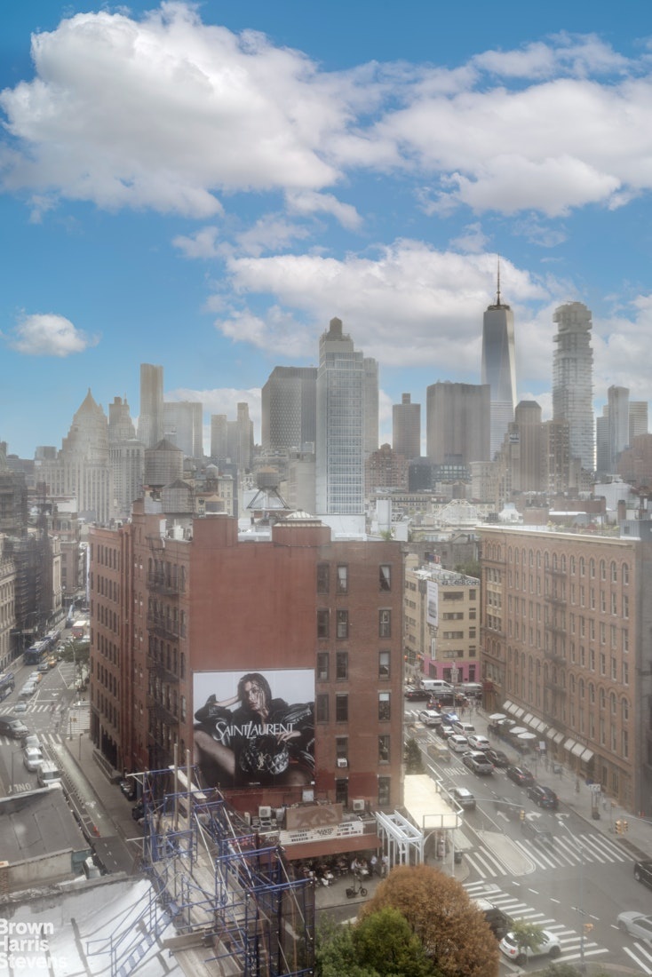 Perfectly placed on a high-floor southwest corner at 225 Lafayette Street (cross street is Spring) in the vibrant heart of Nolita, this spacious, sun-flooded, and serene 1,735-square-foot two bedroom (convertible to three bedroom)/three bathroom pre-war loft condominium is flooded with an abundance of natural daylight and spectacular evening sunsets. Offering open panoramic southwest views over Soho through ten oversized picture windows that frame dramatic downtown views including many historic buildings, this former bank building was converted into 40 loft residences in 2004 and designed by star architects Calvin Tsao and Zack McKown.