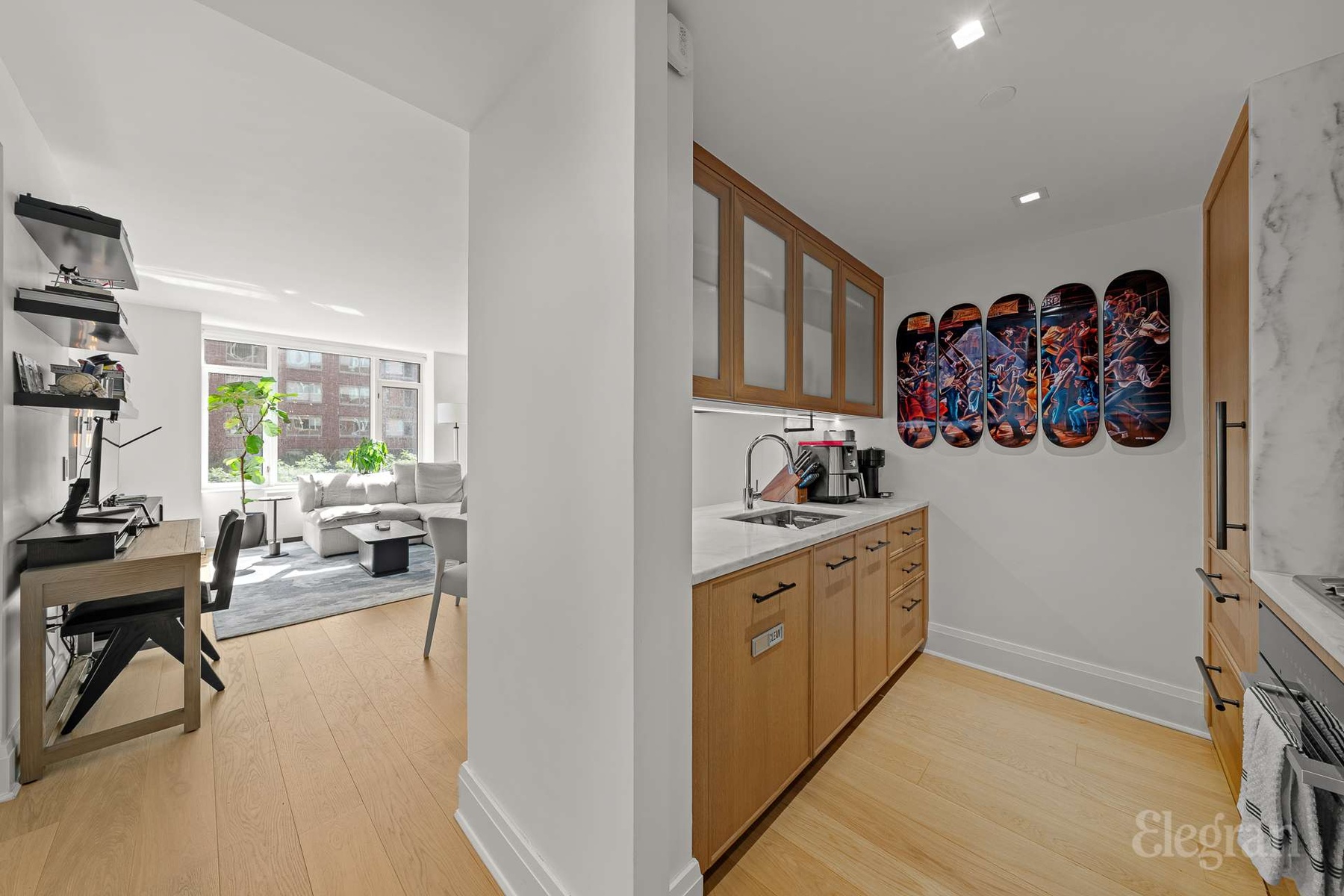 This 676 SF one-bedroom, one-bathroom residence is filled with eastern light and offers views of Battery Park’s greenery. Interiors feature 7-inch-wide oak flooring, Turkish Cristallo stone windowsills, and high-end finishes. The chef’s kitchen is equipped with Miele appliances, custom oak cabinetry, and honed marble counters and backsplash. The living and dining areas provide space for entertaining, while the primary suite includes a walk-in closet and a spa-inspired bathroom finished in statuary and Grigio Nicola marbles. A washer/dryer, smart thermostats, and eco-friendly touches add convenience.