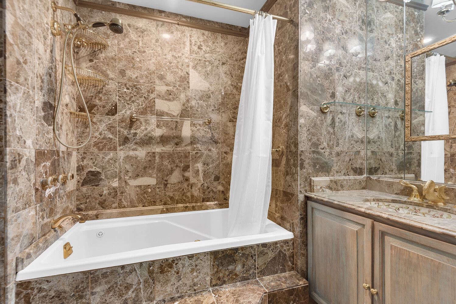 Never wait for the elevator again, just enter through the elegant marble lobby right into your fabulous new home! With great scale and flow, this one bedroom, two bath home is ideal for gracious living and entertaining. Prewar features include high beamed ceilings, beautiful herringbone oak floors and a fabulous decorative fireplace. The peaceful bedroom has great storage space (including built-in storage and desk area) and easily accommodates a king sized bed and oversized furniture. The opulent en suite bath features luxury Sherle Wagner fixtures, an oversized spa tub and marble galore. The second bathroom is similarly fitted and includes a corner shower for those pesky overnight guests. The separate kitchen has tons of cabinet space, stainless appliances, stone countertops and a glass block window and mosaic tile floors and backsplash provide a whimsical midcentury modern touch. The large foyer with abundant built-in storage serves as an ideal dining space. Central air, too! On top of that, you will enjoy easy access to the building's common garden down the hall, which is nicely landscaped and furnished with lounges and BBQs for your relaxation.