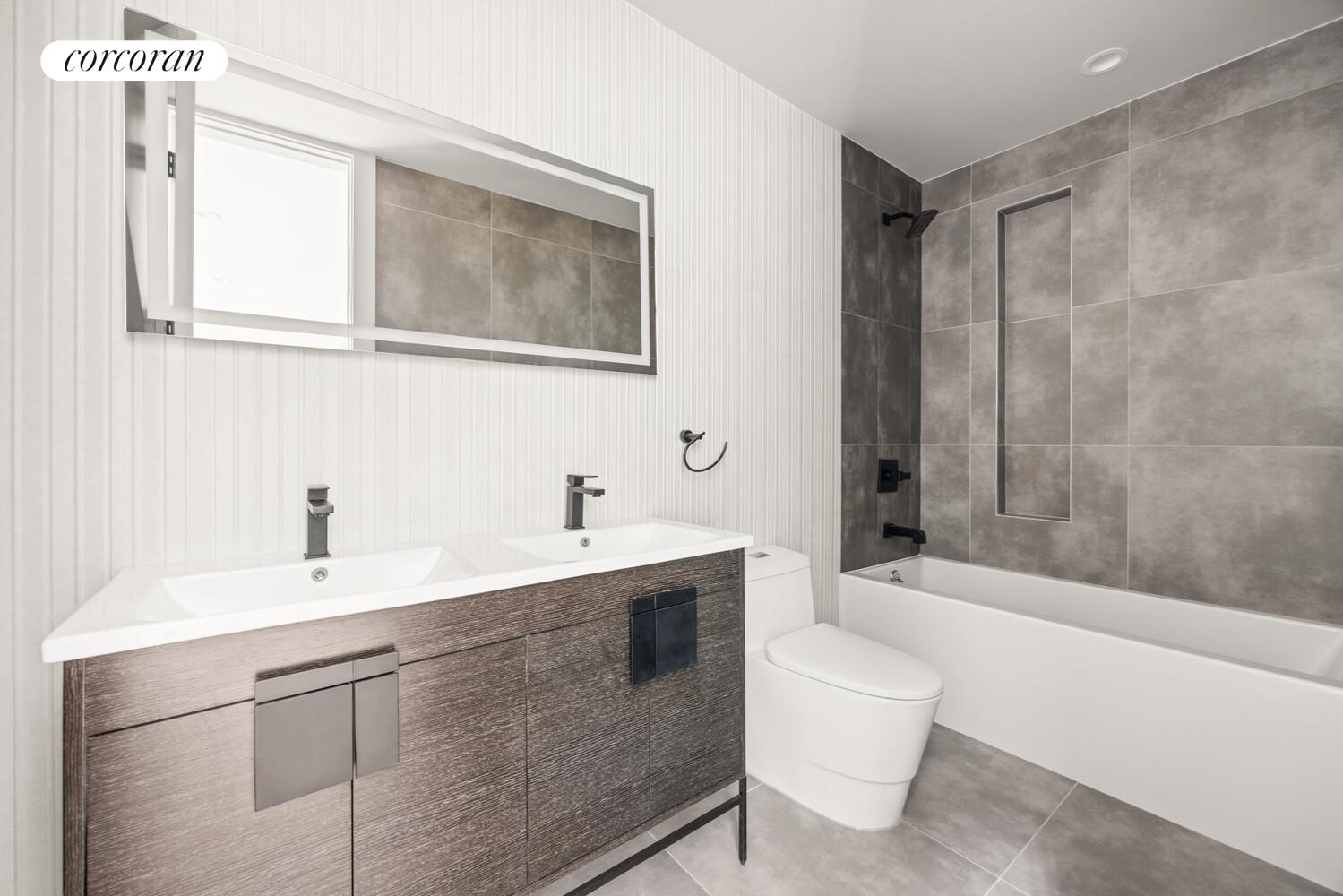 The bedroom comfortably fits a king-size, while the spa-like bathroom is a serene retreat with grey tile, radiant heated floors, a double vanity, oversized LED mirror, and a deep soaking tub.
