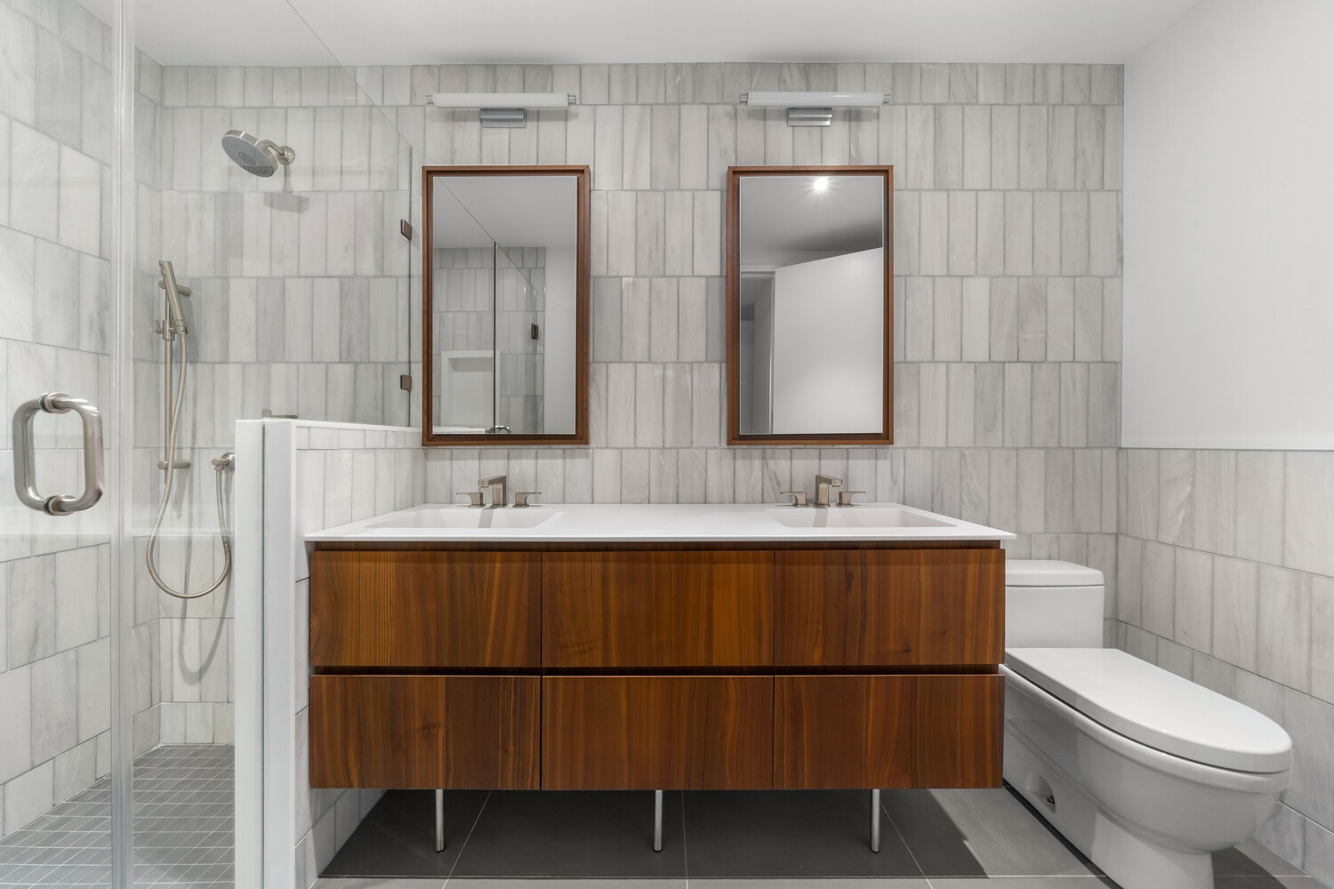 Featuring all the luxuries of a modern home, the residence includes an open, gourmet kitchen equipped with state-of-the-art appliances, wood cabinetry, and a marble, waterfall island. The primary bedroom features a walk in closet, floor to ceiling windows and a spa-like bath with dual sinks, tiled marble walls and top-of-the line fixtures. The sizable secondary bedroom boasts floor to ceiling windows, good closet space and a spa-like bathroom.
