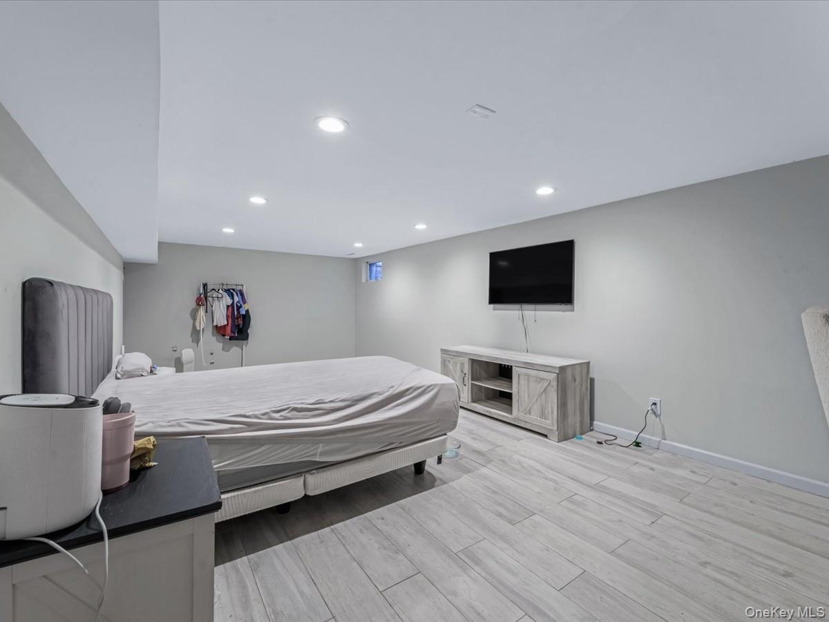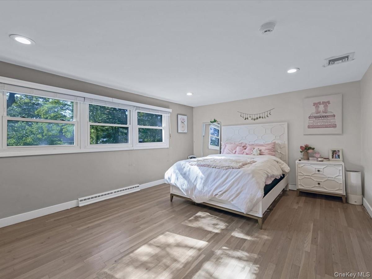 - Bedroom with a baseboard radiator, light wood-type flooring, and recessed lighting