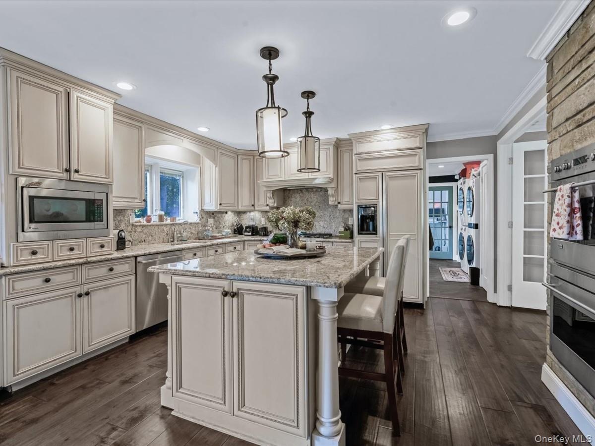 - Kitchen with hanging light fixtures, cream cabinets, stainless steel appliances, dark wood finished floors, and light stone countertops