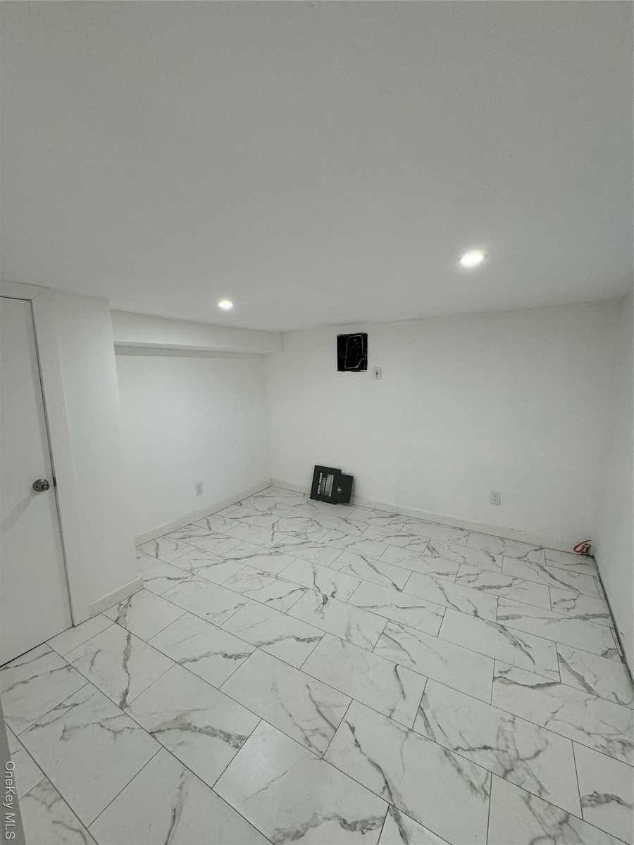 - Finished basement featuring light marble finish flooring and recessed lighting