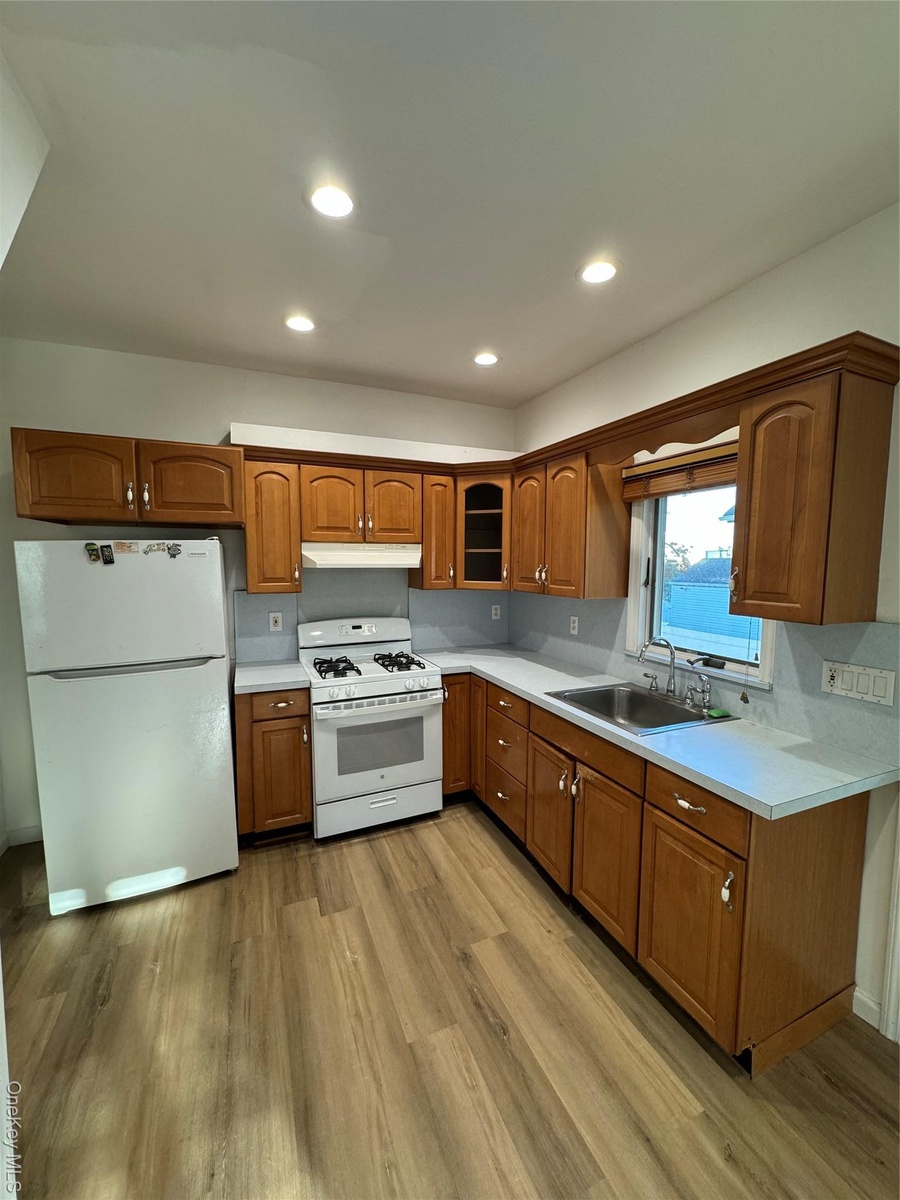 - Kitchen with brown cabinets, fridge, recessed lighting, range, and light wood-style flooring