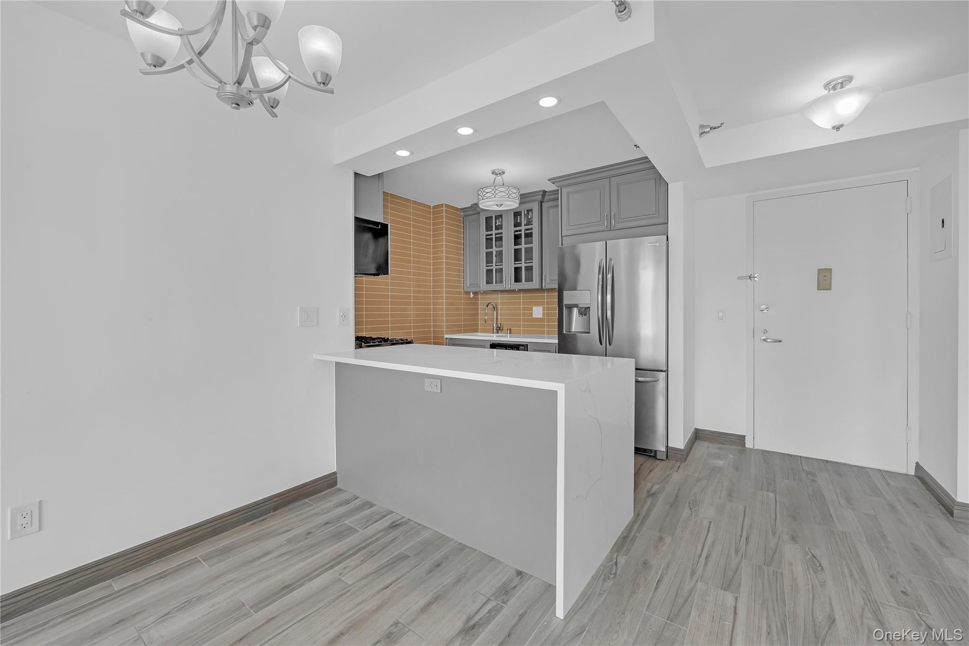 - Kitchen with gray cabinets, a chandelier, decorative backsplash, stainless steel appliances, and light wood finished floors