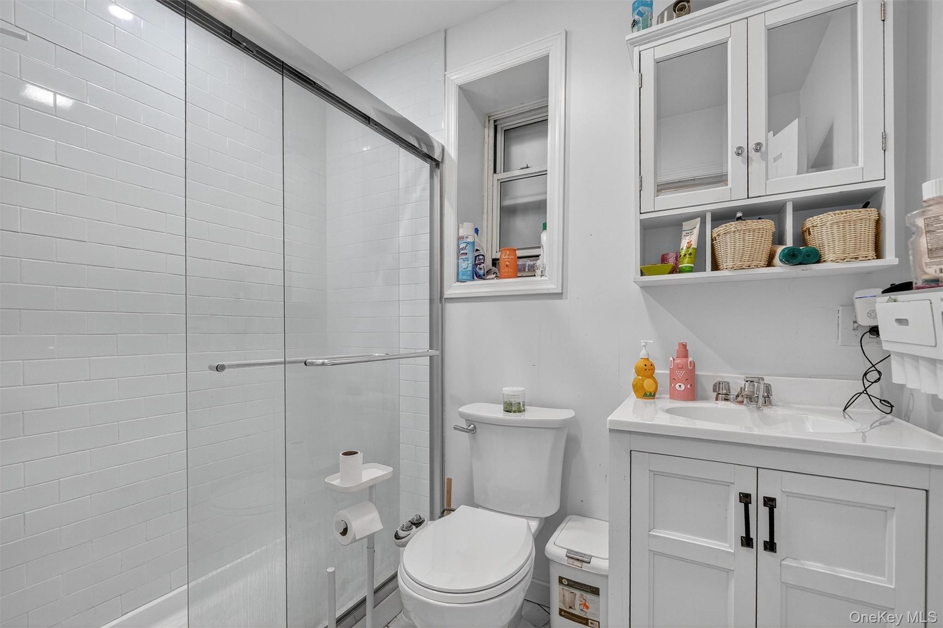 - Full bathroom featuring a shower stall, vanity, and a baseboard radiator