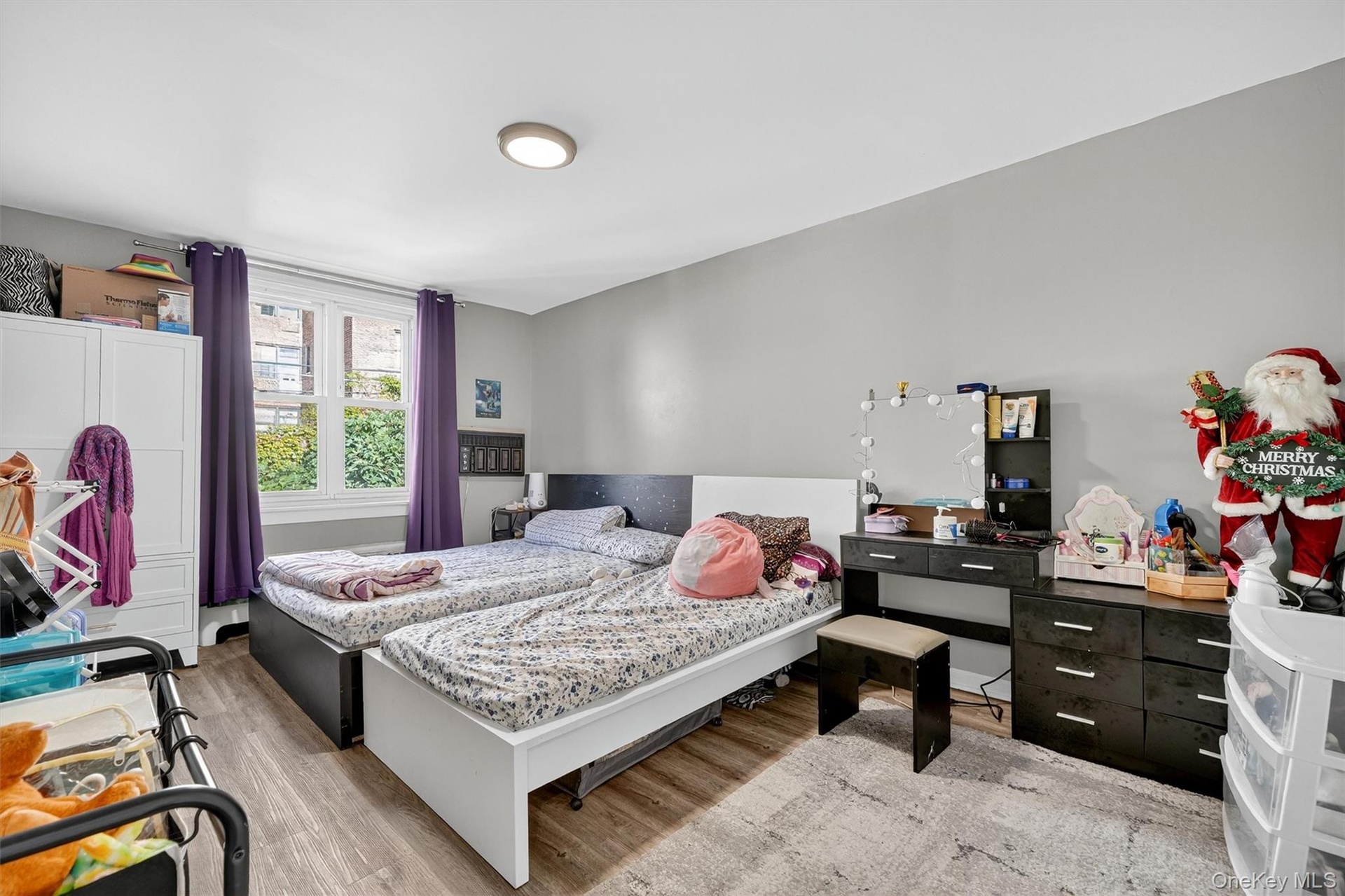 - Bedroom featuring ornamental molding, an office area, and light wood finished floors
