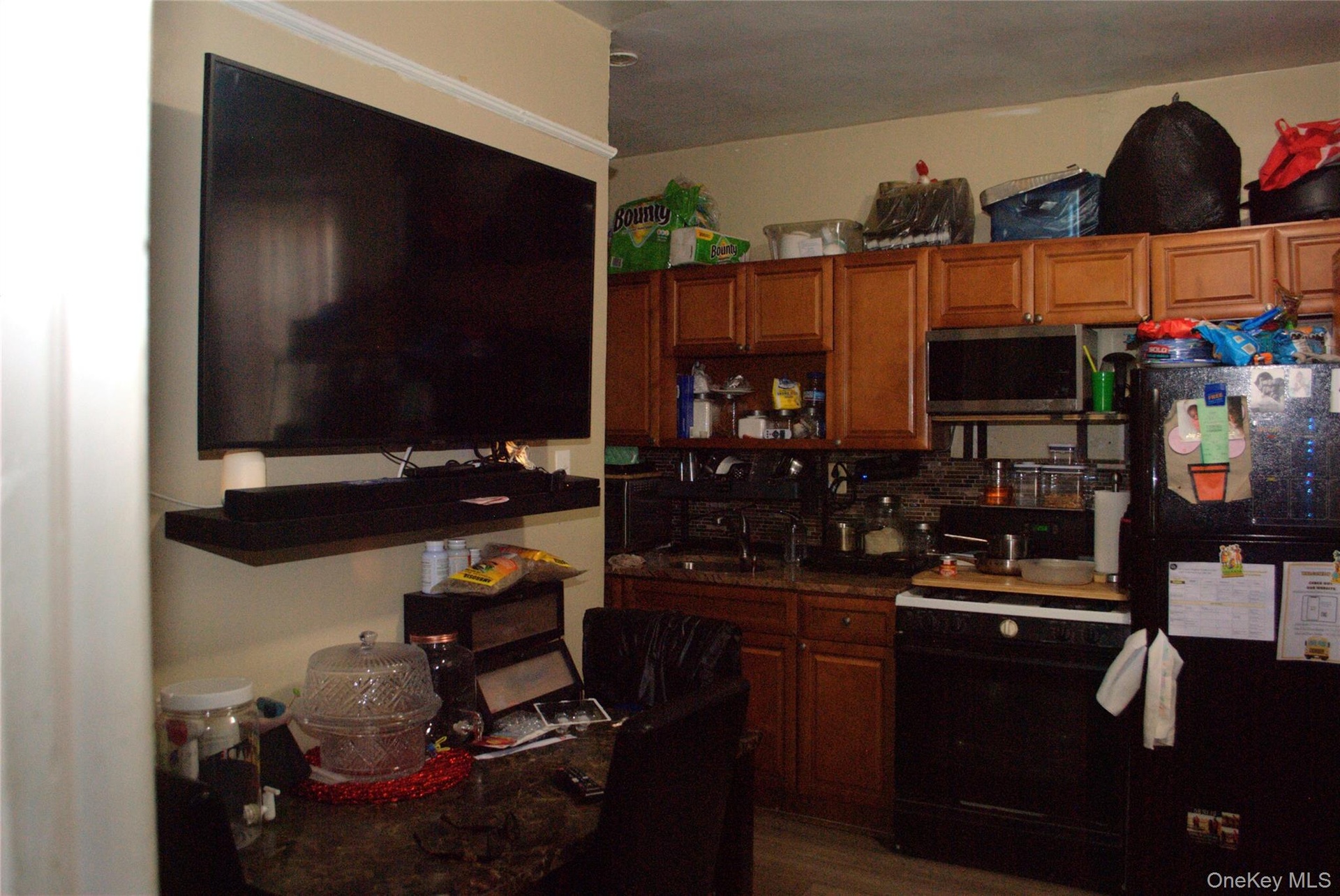 - Kitchen with black appliances, brown cabinets, open shelves, backsplash, and dark wood-style flooring