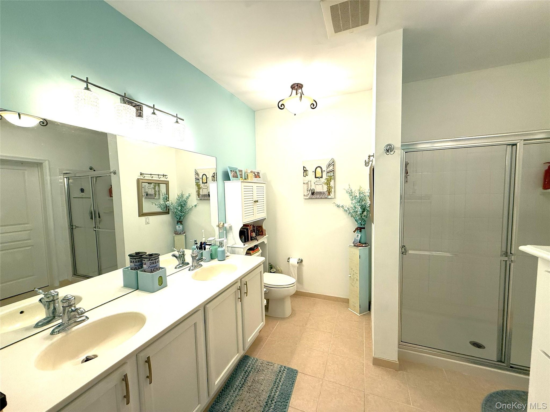 - Full bathroom with double vanity, a stall shower, and light tile patterned flooring