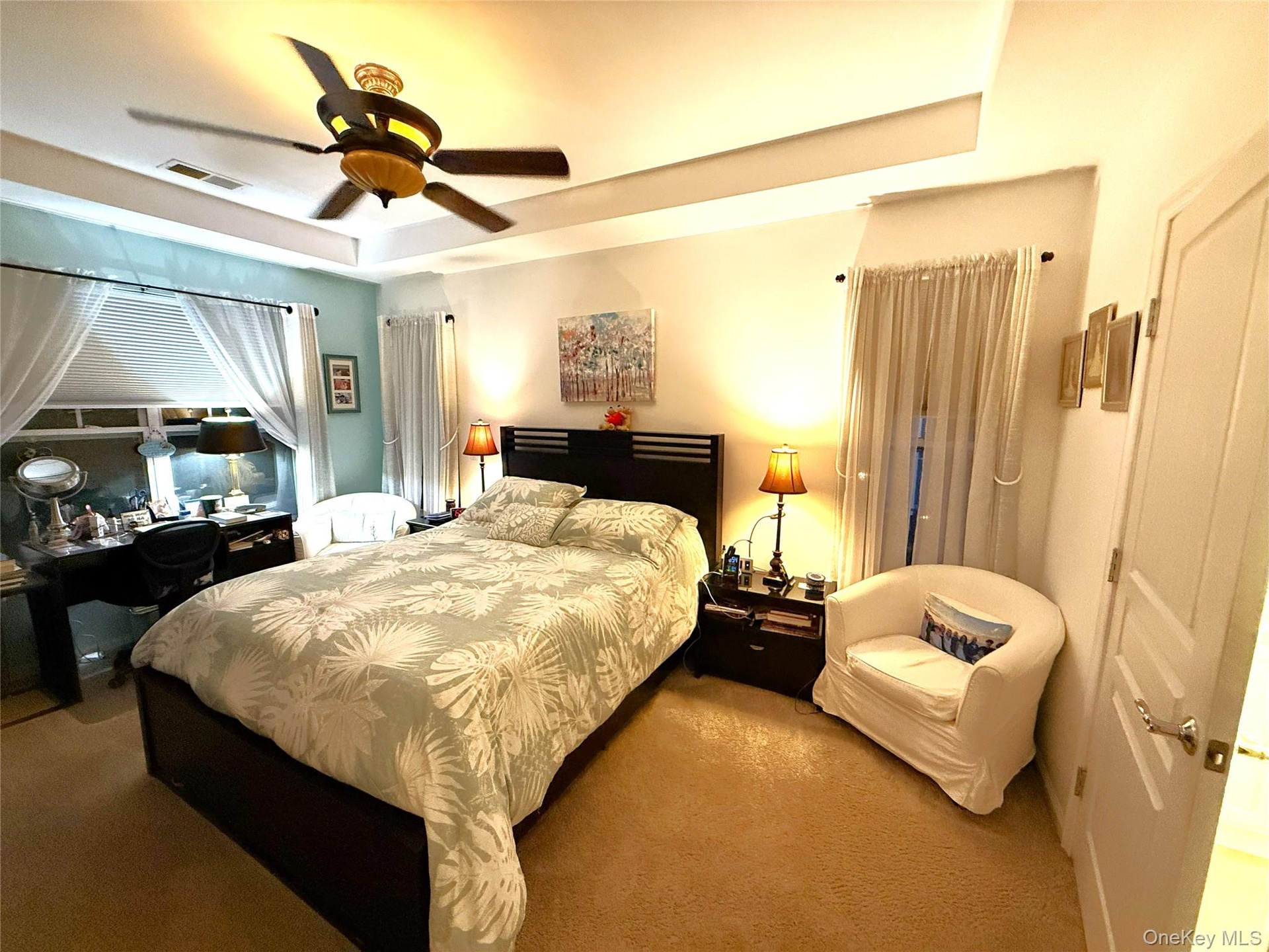 - Bedroom with carpet floors, a tray ceiling, and ceiling fan