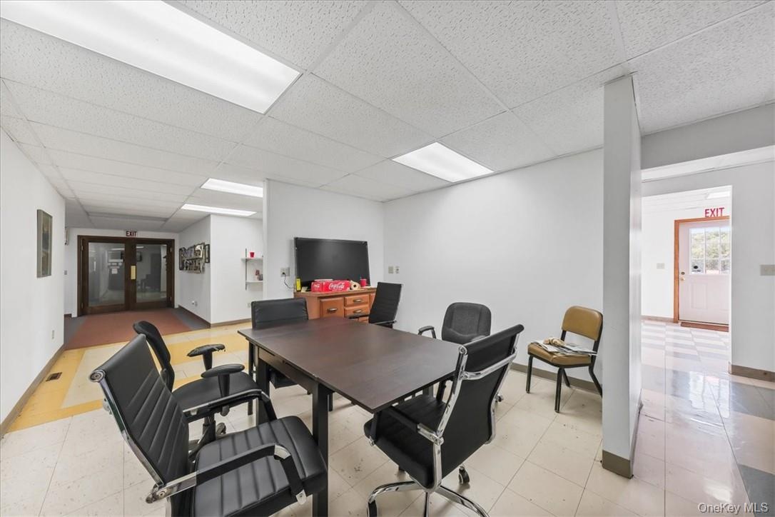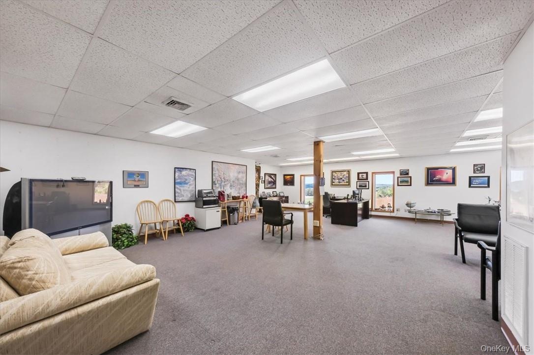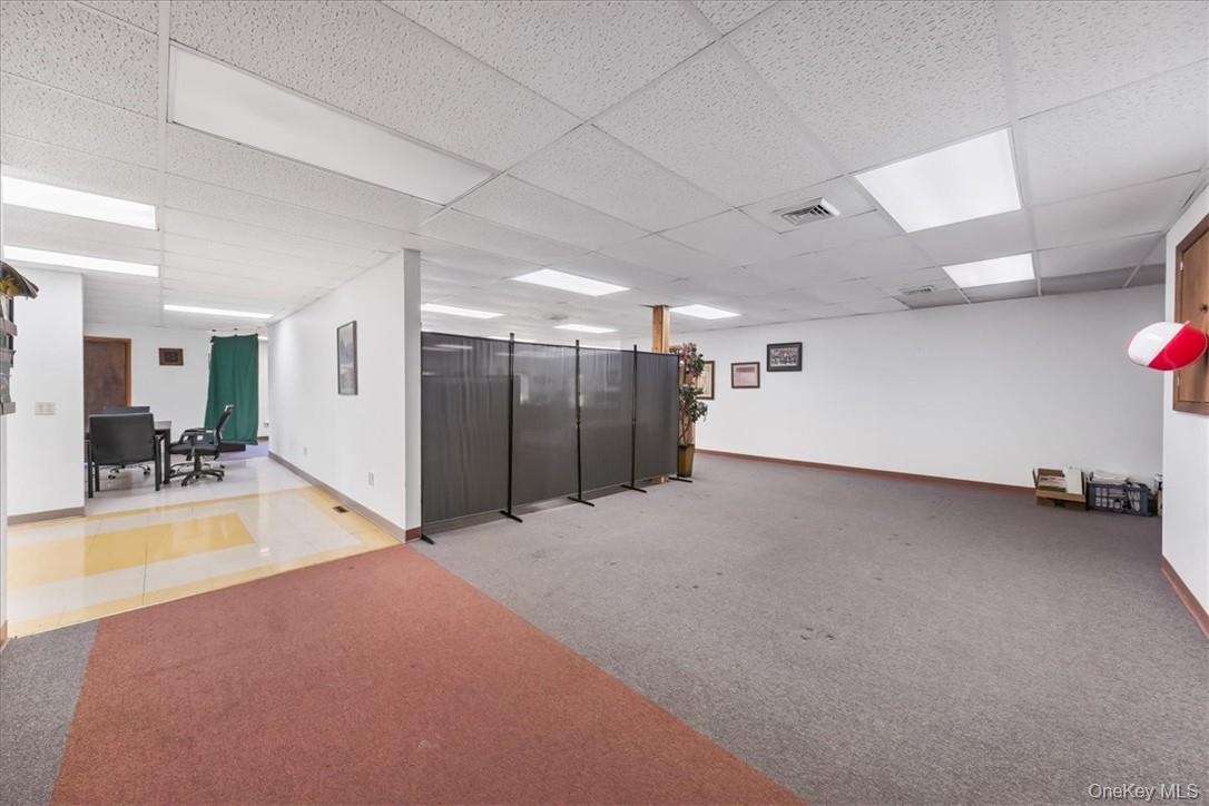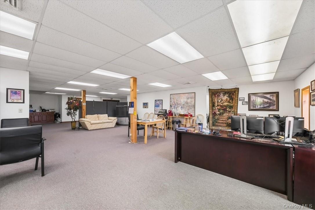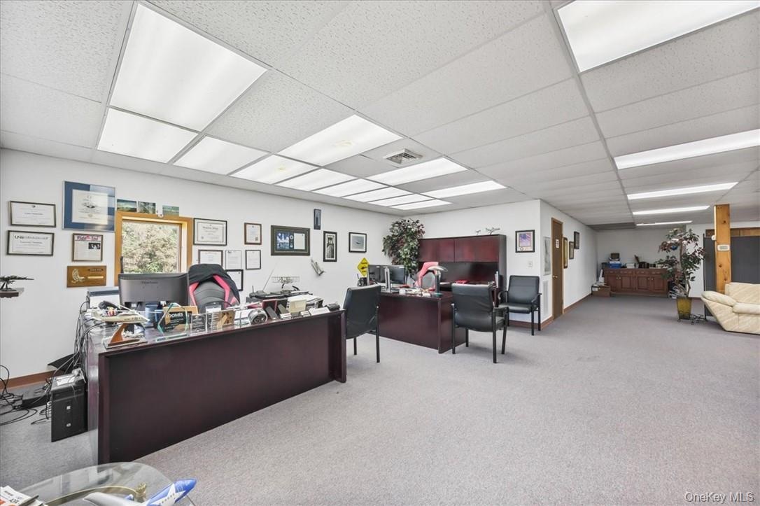 - Office with a drop ceiling and carpet flooring