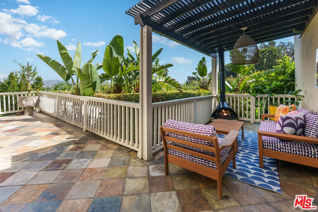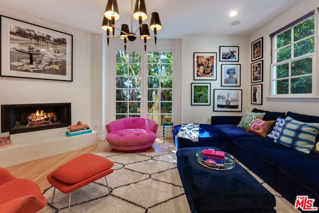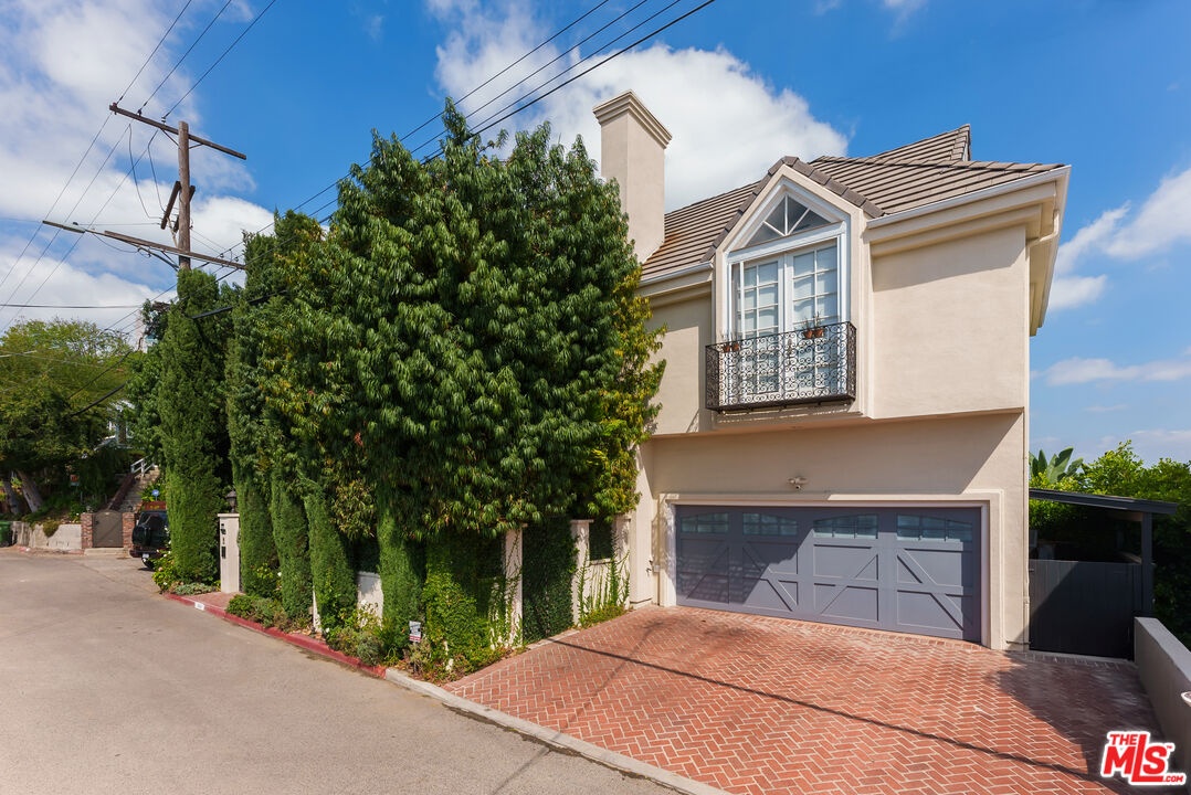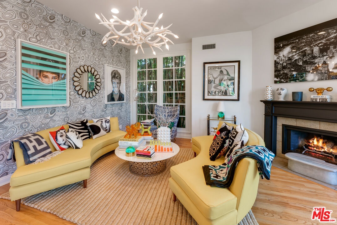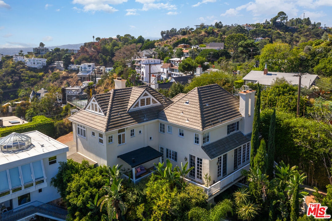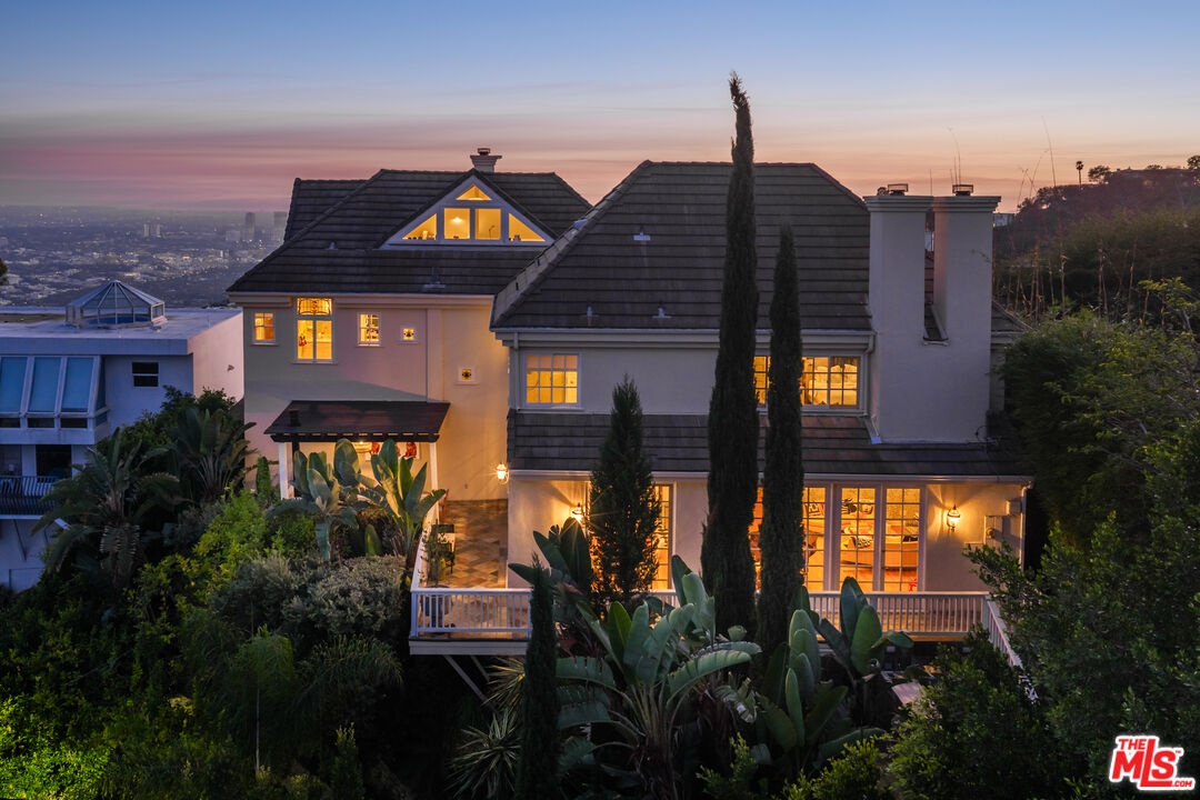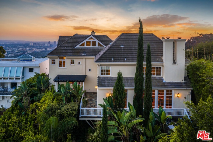 Perched high in the Hollywood Hills West, on a celebrity lined street, this private apx 4,000 sq ft hillside retreat offers modern sophistication with sweeping views of the city, mountains, and the iconic Hollywood sign - just minutes from the flats of West Hollywood, the legendary Sunset Strip, Studio City, and close to everything of interest. A dramatic entry courtyard, complete with Italian Cypress, lavender, and a custom fountain, sets the stage. Inside, soaring 14-foot ceilings and designer details - including Fornasetti and Scalamandre wall-coverings, Ralph Lauren and Jonathan Adler lighting throughout, oak floors, and George Nelson pendants - create a refined yet inviting atmosphere. The open living and dining areas flow seamlessly to expansive terraces designed for entertaining. A chef's kitchen boasts a glass-door Sub-Zero refrigerator, Viking appliances, and generous counter space. Multiple outdoor dining and lounging areas are enhanced by a fireplace, outdoor kitchen, and fruiting lemon trees. Three spacious ensuite bedrooms each feature walk-in closets and stunning views. Dual primary suites offer fireplaces, steam showers, and private balconies, while a separate staircase leads to a third ensuite bedroom and a custom loft. A den/screening room with surround sound and fireplace completes the interior. Outdoors, meandering stone pathways lead to a half basketball court under custom lighting - perfect for recreation or gatherings. A two-car garage, natural light throughout, and layered landscaping enhance this hillside oasis. Located within the award-winning Wonderland School District, this property offers privacy, style, and an entertainer's dream setting in the heart of the Hollywood Hills.