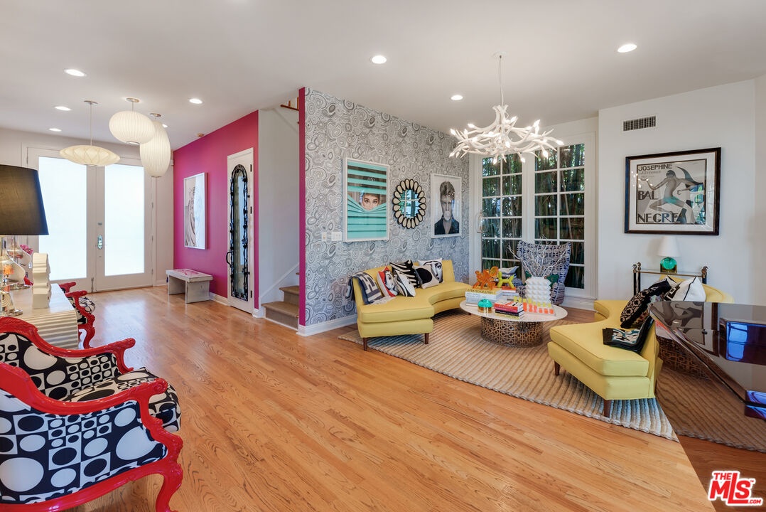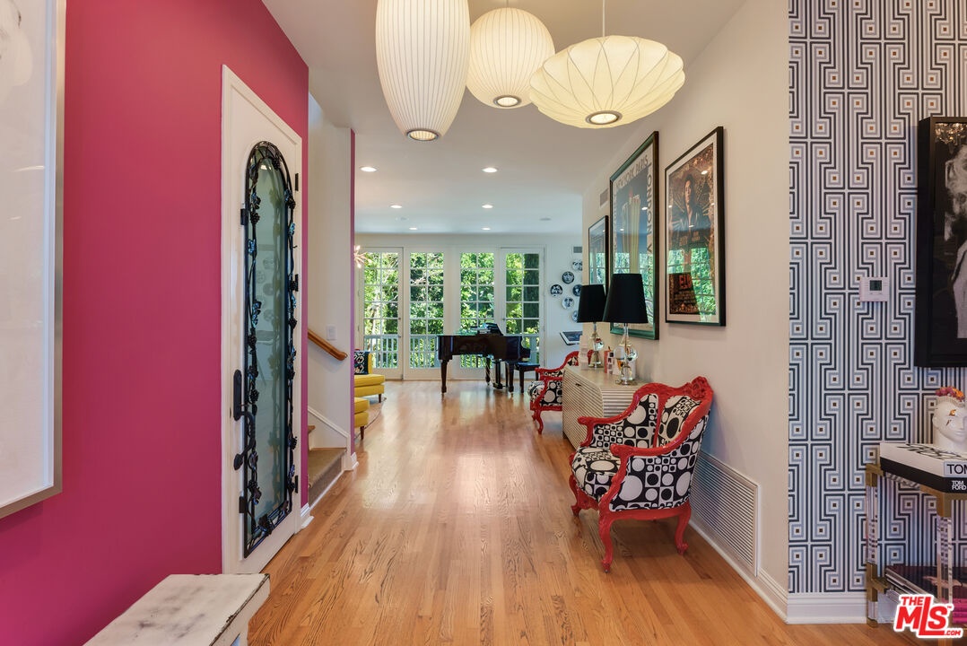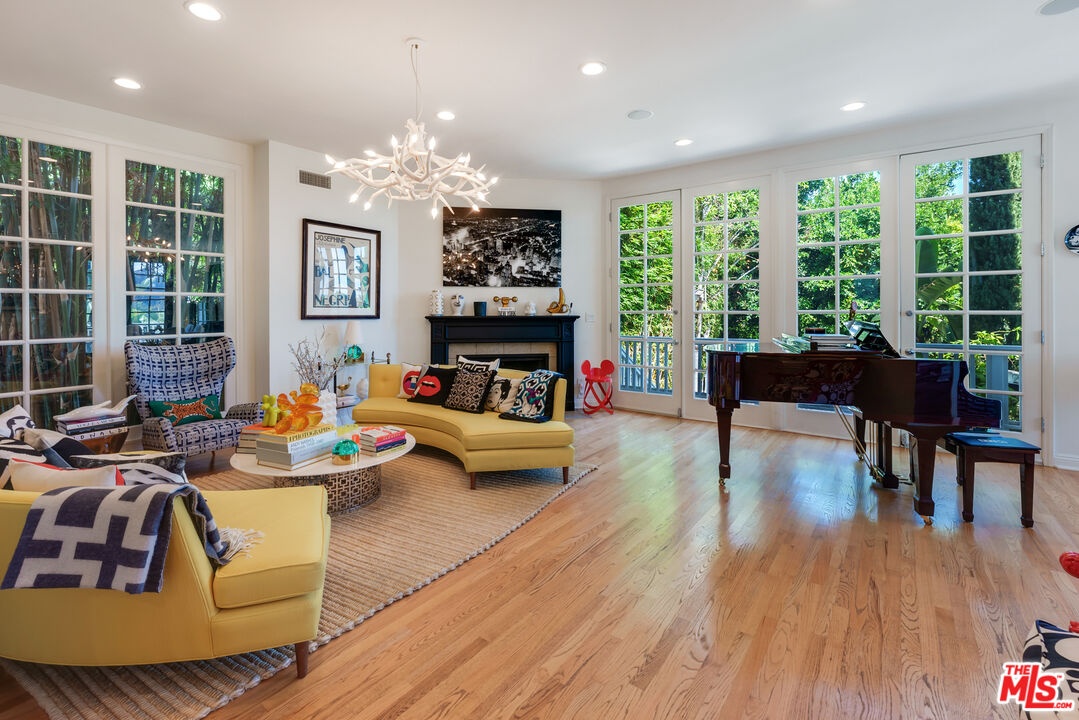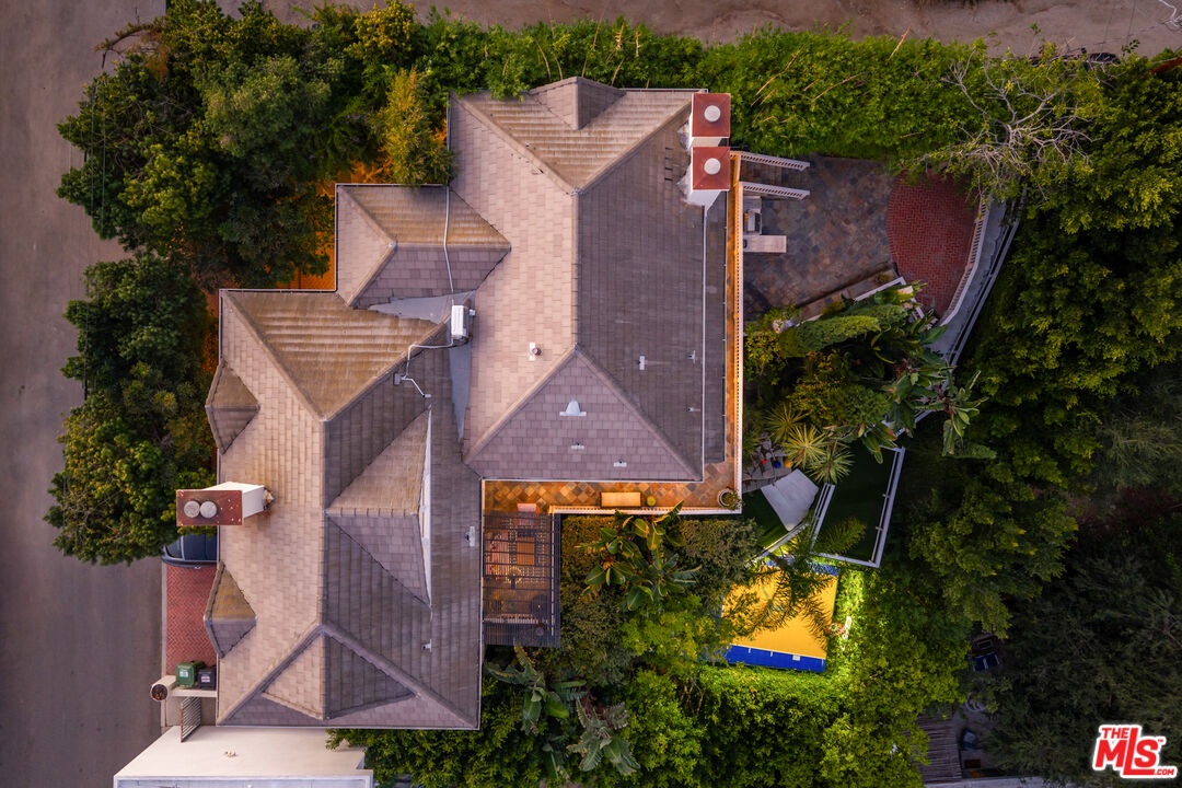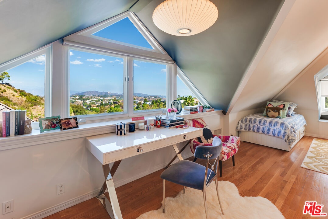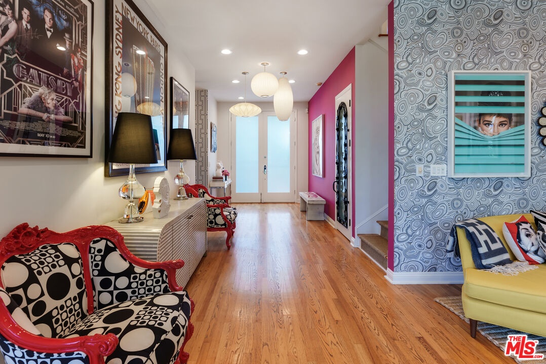 Perched high in the Hollywood Hills West, on a celebrity lined street, this private apx 4,000 sq ft hillside retreat offers modern sophistication with sweeping views of the city, mountains, and the iconic Hollywood sign - just minutes from the flats of West Hollywood, the legendary Sunset Strip, Studio City, and close to everything of interest. A dramatic entry courtyard, complete with Italian Cypress, lavender, and a custom fountain, sets the stage. Inside, soaring 14-foot ceilings and designer details - including Fornasetti and Scalamandre wall-coverings, Ralph Lauren and Jonathan Adler lighting throughout, oak floors, and George Nelson pendants - create a refined yet inviting atmosphere. The open living and dining areas flow seamlessly to expansive terraces designed for entertaining. A chef's kitchen boasts a glass-door Sub-Zero refrigerator, Viking appliances, and generous counter space. Multiple outdoor dining and lounging areas are enhanced by a fireplace, outdoor kitchen, and fruiting lemon trees. Three spacious ensuite bedrooms each feature walk-in closets and stunning views. Dual primary suites offer fireplaces, steam showers, and private balconies, while a separate staircase leads to a third ensuite bedroom and a custom loft. A den/screening room with surround sound and fireplace completes the interior. Outdoors, meandering stone pathways lead to a half basketball court under custom lighting - perfect for recreation or gatherings. A two-car garage, natural light throughout, and layered landscaping enhance this hillside oasis. Located within the award-winning Wonderland School District, this property offers privacy, style, and an entertainer's dream setting in the heart of the Hollywood Hills.