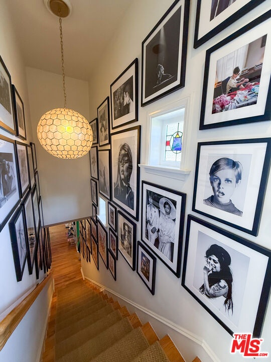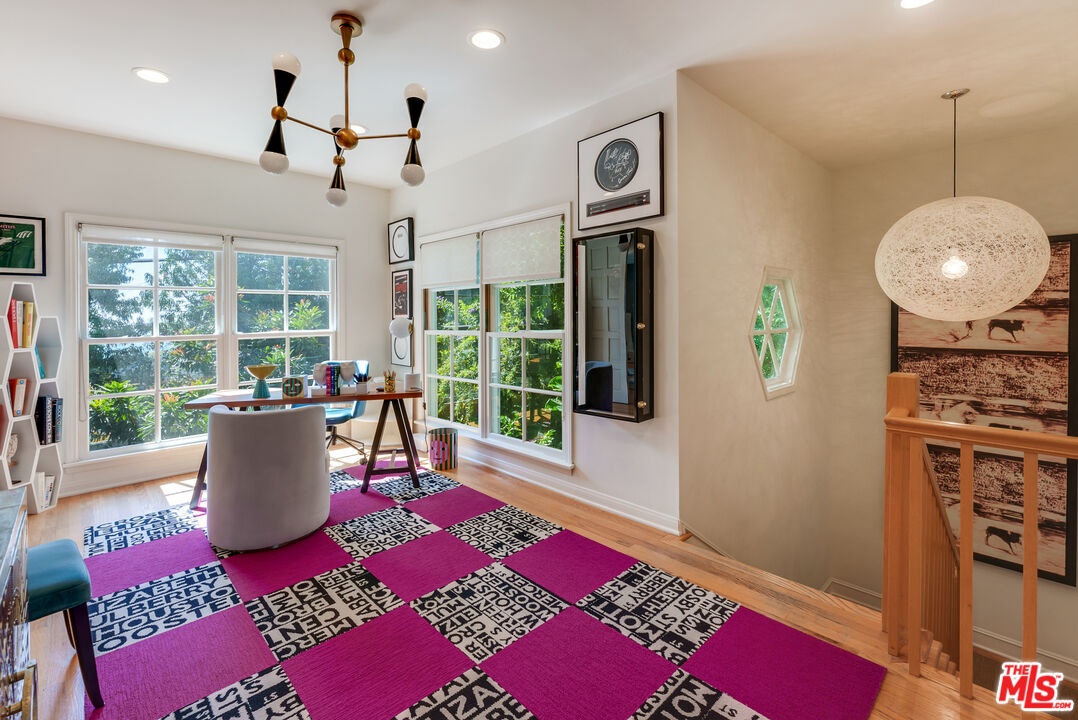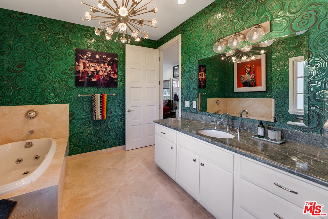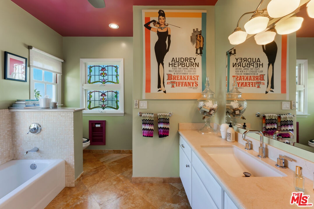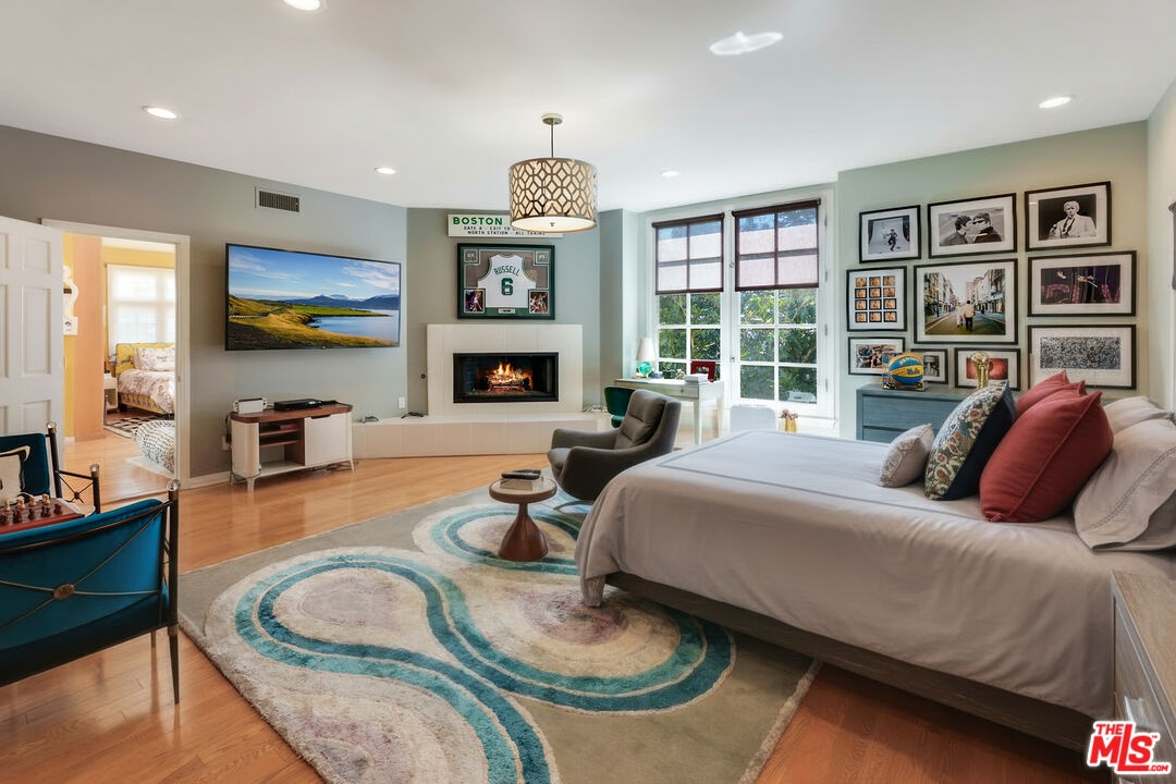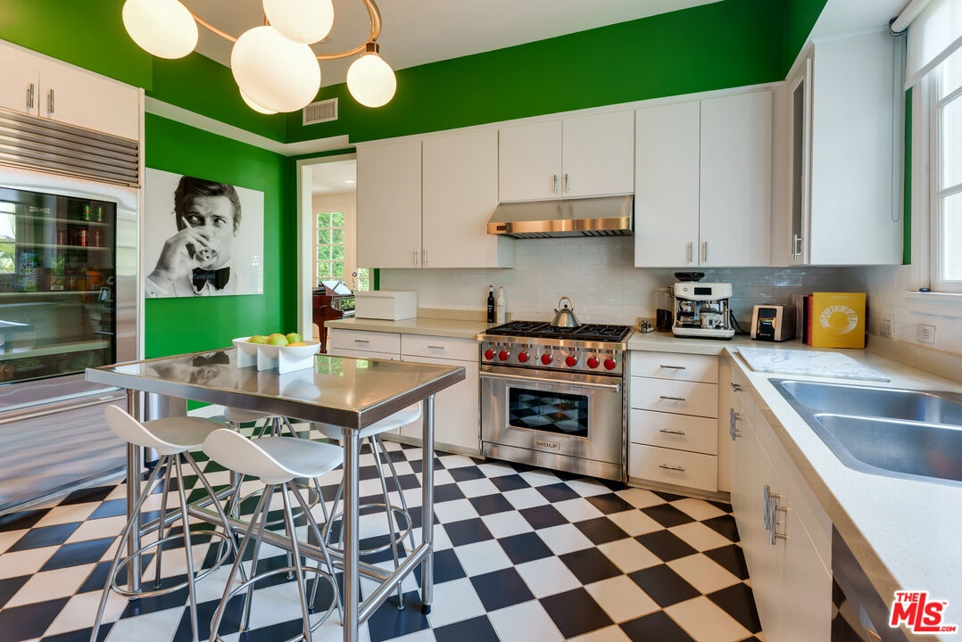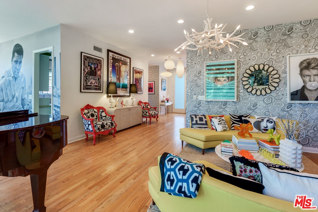 Perched high in the Hollywood Hills West, on a celebrity lined street, this private apx 4,000 sq ft hillside retreat offers modern sophistication with sweeping views of the city, mountains, and the iconic Hollywood sign - just minutes from the flats of West Hollywood, the legendary Sunset Strip, Studio City, and close to everything of interest. A dramatic entry courtyard, complete with Italian Cypress, lavender, and a custom fountain, sets the stage. Inside, soaring 14-foot ceilings and designer details - including Fornasetti and Scalamandre wall-coverings, Ralph Lauren and Jonathan Adler lighting throughout, oak floors, and George Nelson pendants - create a refined yet inviting atmosphere. The open living and dining areas flow seamlessly to expansive terraces designed for entertaining. A chef's kitchen boasts a glass-door Sub-Zero refrigerator, Viking appliances, and generous counter space. Multiple outdoor dining and lounging areas are enhanced by a fireplace, outdoor kitchen, and fruiting lemon trees. Three spacious ensuite bedrooms each feature walk-in closets and stunning views. Dual primary suites offer fireplaces, steam showers, and private balconies, while a separate staircase leads to a third ensuite bedroom and a custom loft. A den/screening room with surround sound and fireplace completes the interior. Outdoors, meandering stone pathways lead to a half basketball court under custom lighting - perfect for recreation or gatherings. A two-car garage, natural light throughout, and layered landscaping enhance this hillside oasis. Located within the award-winning Wonderland School District, this property offers privacy, style, and an entertainer's dream setting in the heart of the Hollywood Hills.