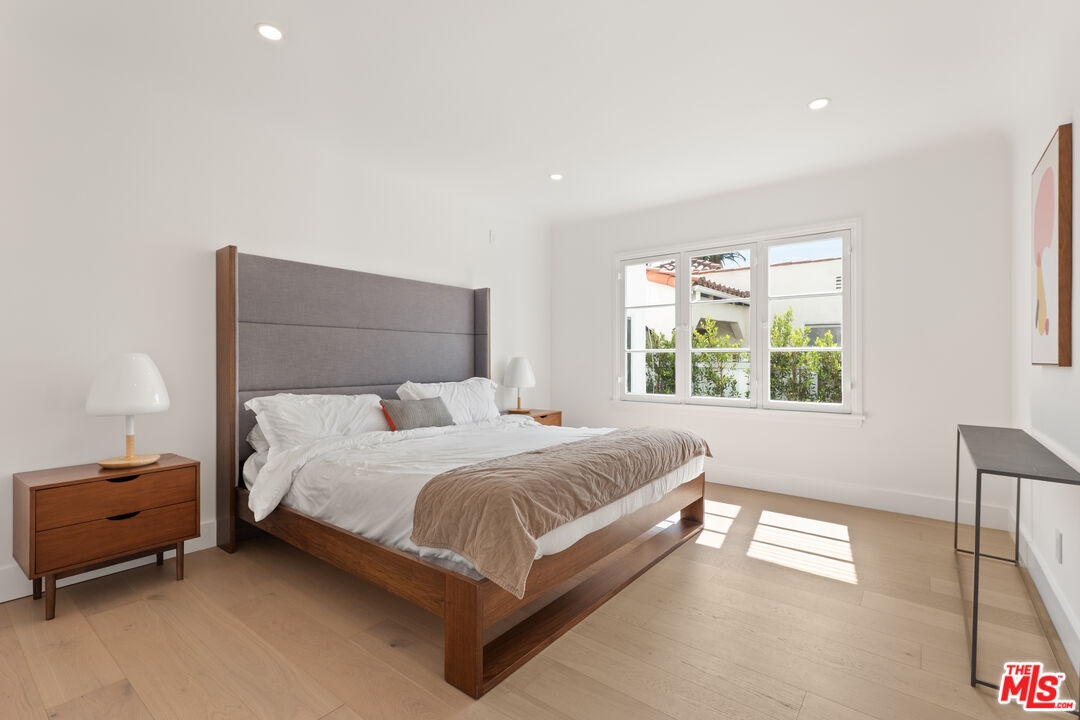 Located on one of Beverly Grove's most desirable and quiet streets, this updated first floor residence of a duplex features 3 bedrooms and 2 bathrooms with a bright, modern layout. The home includes new wide-plank oak flooring, a refreshed kitchen with quartz countertops and stainless steel appliances, and a comfortable living room with arched windows and a decorative fireplace. Both bathrooms have been renovated with modern finishes, and the bedrooms offer great natural light and closet space. Additional highlights include central heating and air, an in-unit washer and dryer, and 1 covered garage spaces. The property is offered fully furnished for a convenient move-in or can be leased unfurnished if preferred. The hedged yard provides privacy and a peaceful setting while being close to Melrose Avenue, The Grove, and West Hollywood. A great opportunity to enjoy an updated home in a prime Beverly Grove location.