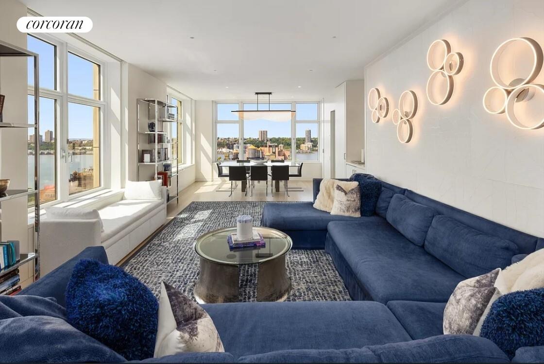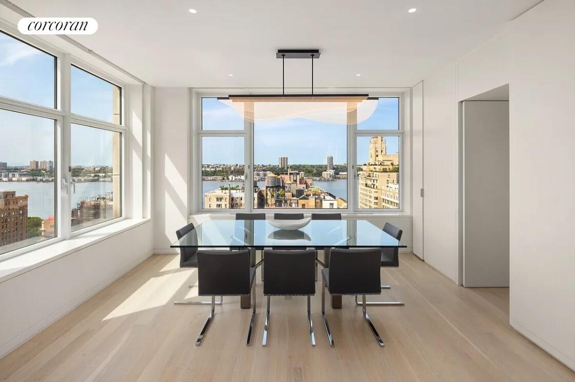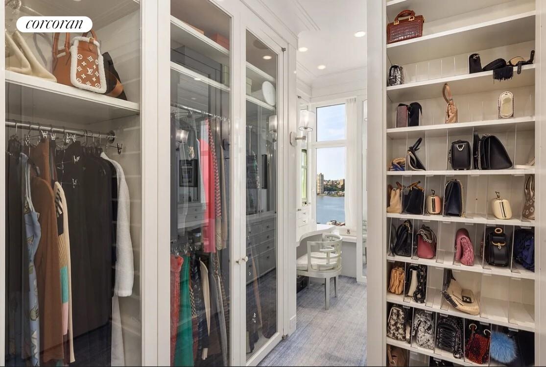 The primary suite is truly an oasis encompassing the southeastern corner of the apartment, which has three exposures and beautiful river views. Enter the oval gallery where you are led to the large corner bedroom and the full dressing room complete with custom cabinetry storage and closets and built-in windowed make-up area. An exquisite south-facing 6-fixture primary marble bathroom with large soaking tub, dual vanity, as well as a large shower room and w/c with toilet and bidet. And finally, there are additional closets and storage as you enter into the lovely bight and intimate sitting room/office.