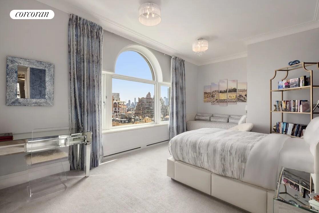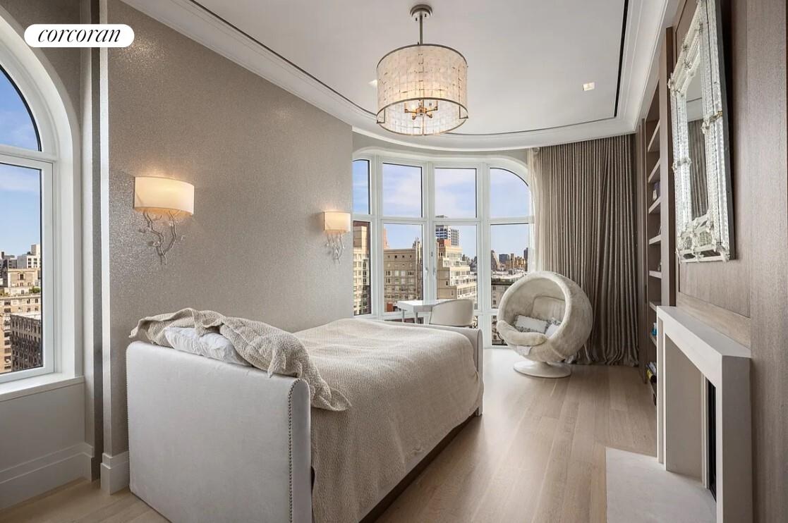 Arrive on your private elevator landing, and you are swept into this beautiful home. Light and views abound from the large oversized arched windows throughout the apartment. From the main foyer, the large library lies ahead, with two grand picture windows that offer incredible northern views and light. The corner great room is centered on the fireplace and includes the large formal dining area.