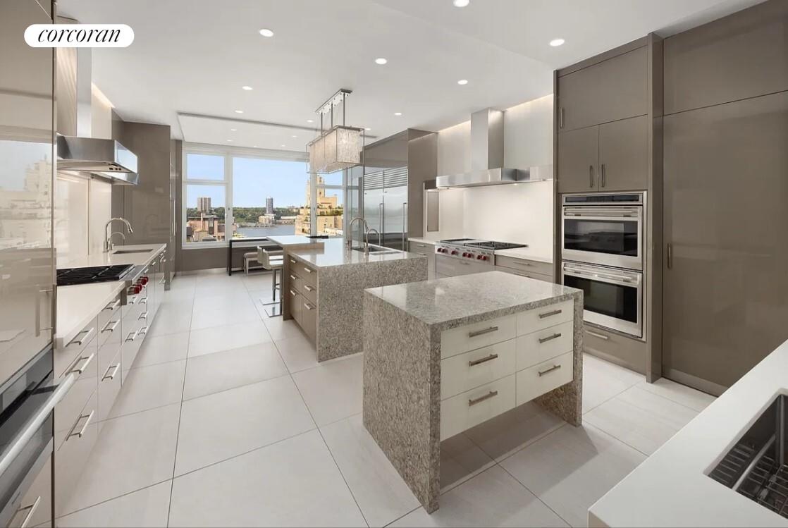 The Kitchen is a modern marvel with dual workstations, each with separate sinks, stoves, ovens, and dishwashers, as well as an oversized walk-in pantry, and two center islands, and includes a breakfast bar and work space. The informal dining room and den are adjacent to the kitchen, all with incredible river views.