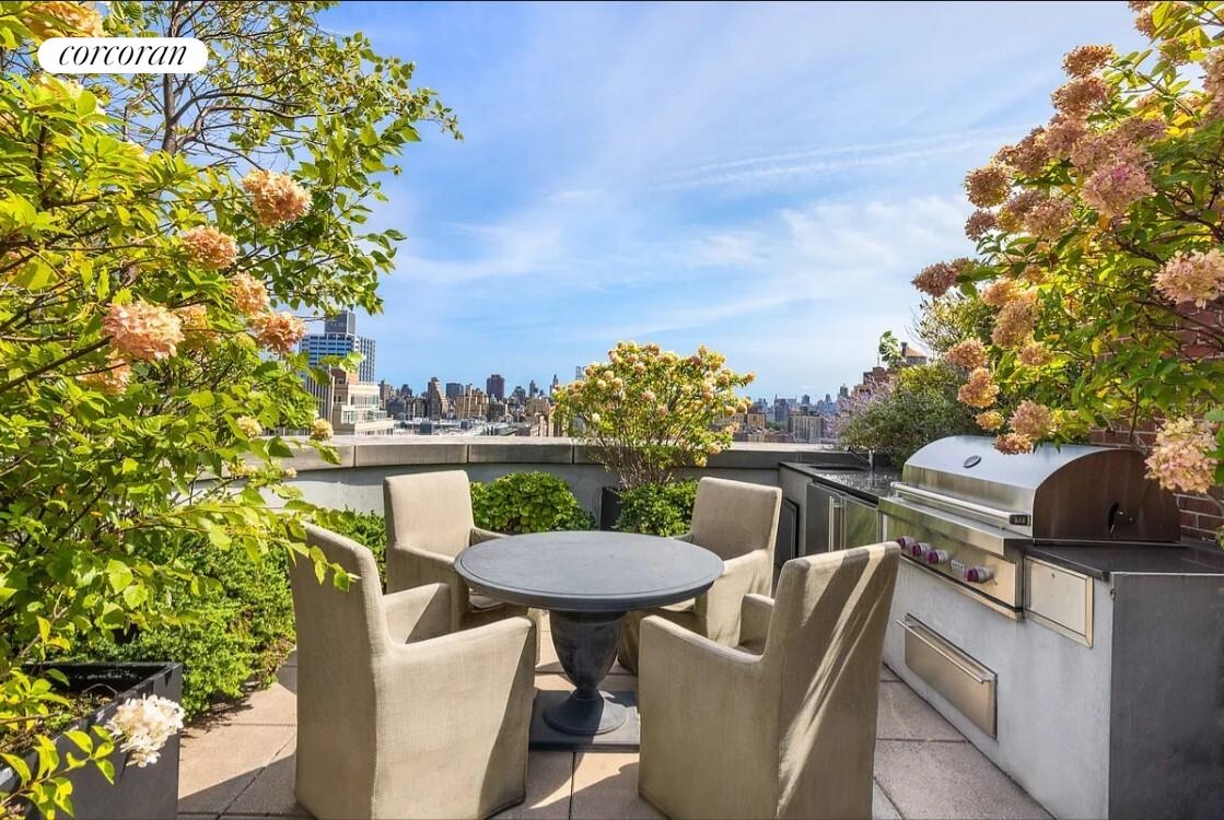 An elegant staircase and an interior private elevator lead to the fully landscaped roof terrace outfitted with an outdoor kitchen, gas grill, multiple seating areas, and an outdoor fireplace.