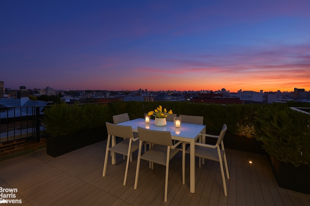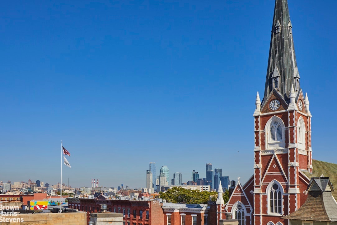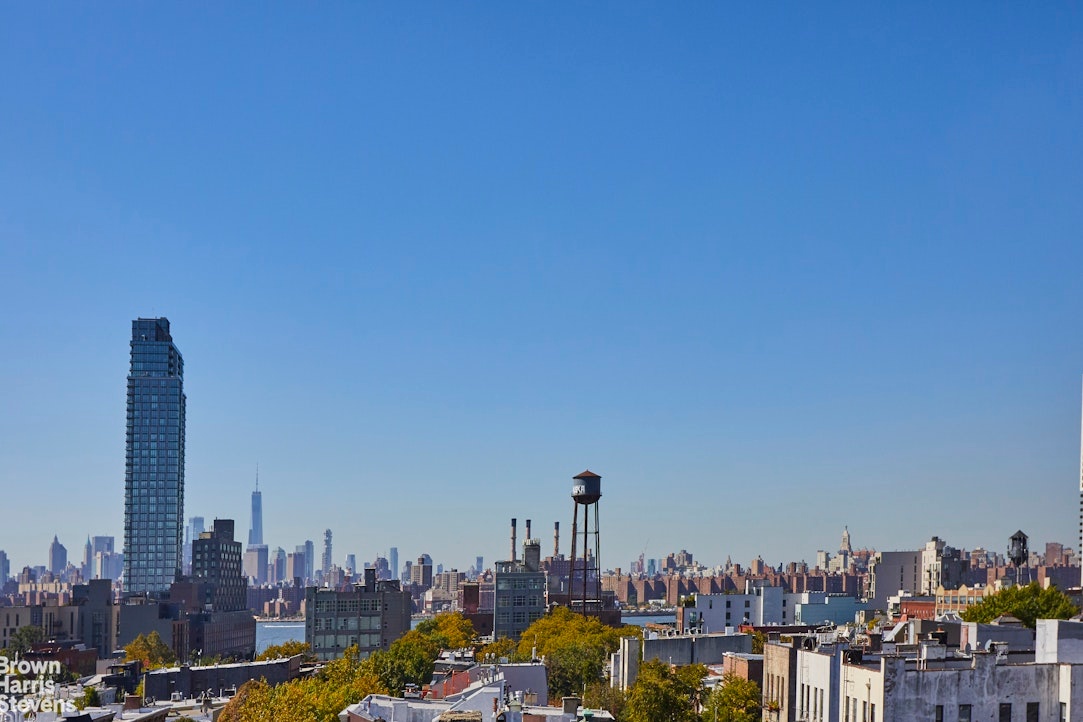 Contemporary conveniences abound, including Nest multi-zoned central heating and cooling, integrated Lutron lighting and shade system, herringbone inlaid oak floors, oversized triple-paned Pella windows, Virtual Doorman, and keyed elevator access. Enjoy your locked and private rooftop cabana, directly accessed by the keyed elevator and with iconic sweeping views of Brooklyn, the East River, and the Manhattan skyline. An additional small private exit off the primary bedroom is perfect for an intimate outdoor escape.