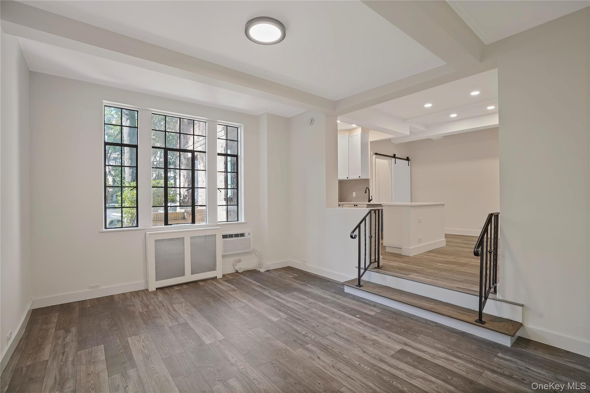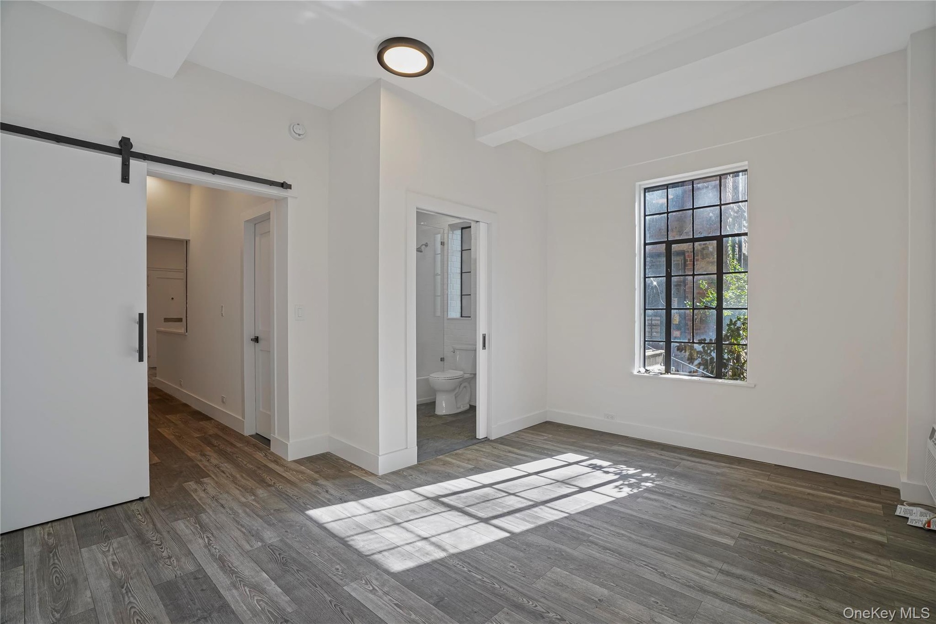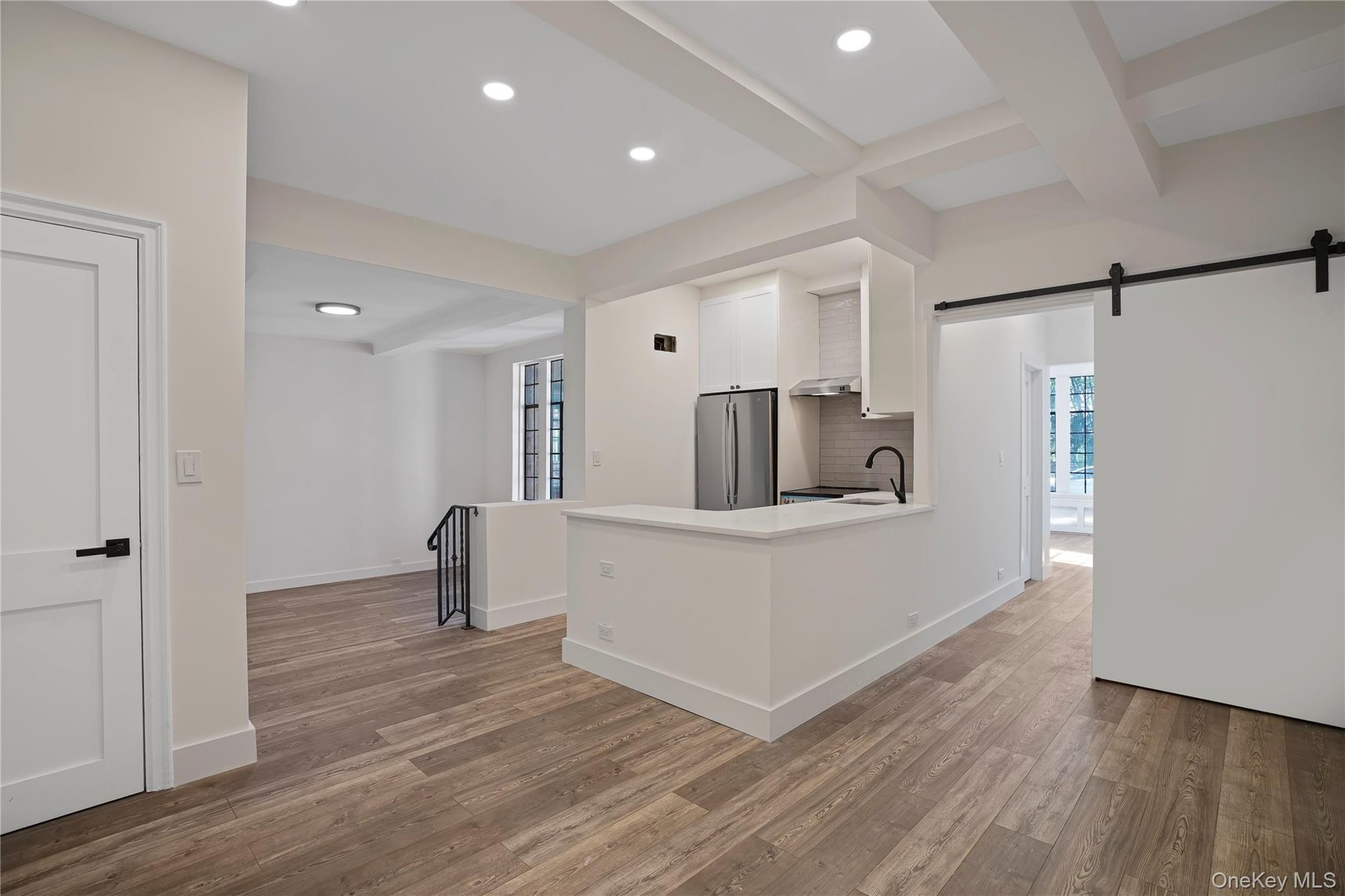 - Empty room with a barn door, light wood-style floors, recessed lighting, and beam ceiling