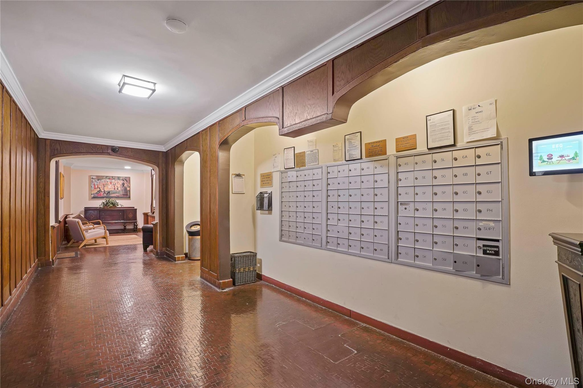 - Corridor with brick floors, crown molding, arched walkways, and wooden walls