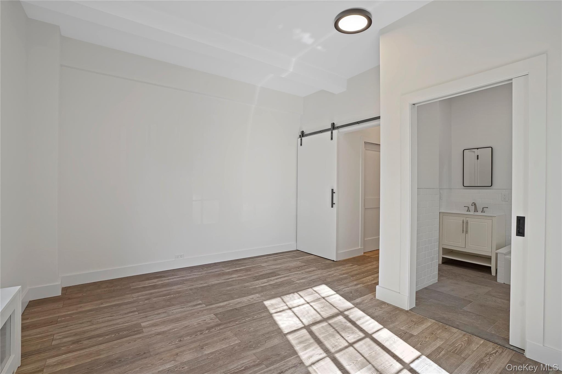 - Unfurnished bedroom with a barn door, light wood finished floors, and ensuite bathroom