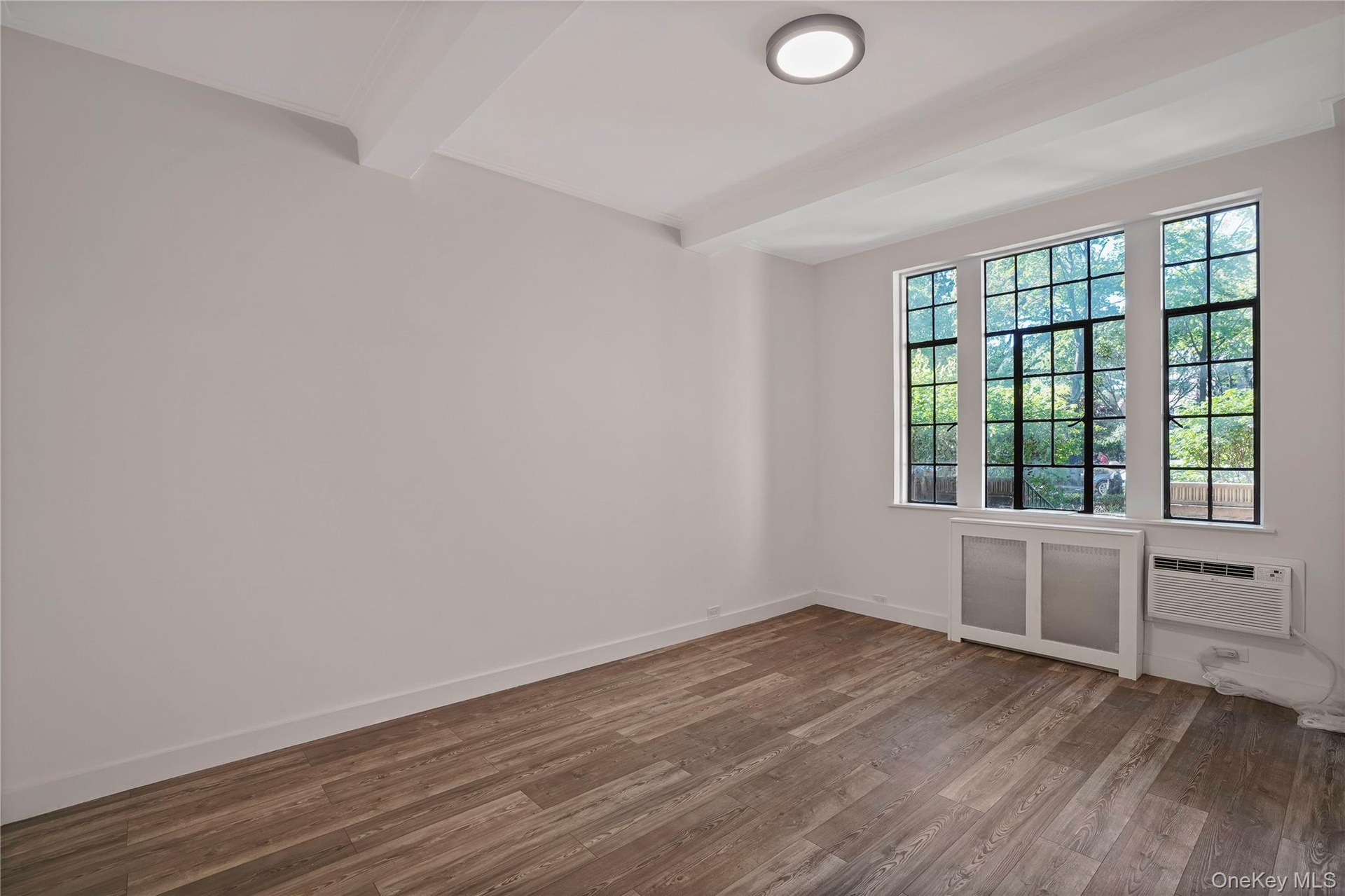 - Empty room featuring radiator heating unit, light wood finished floors, beam ceiling, and an AC wall unit
