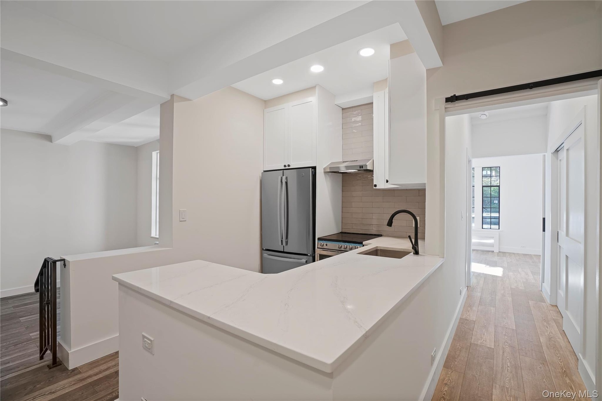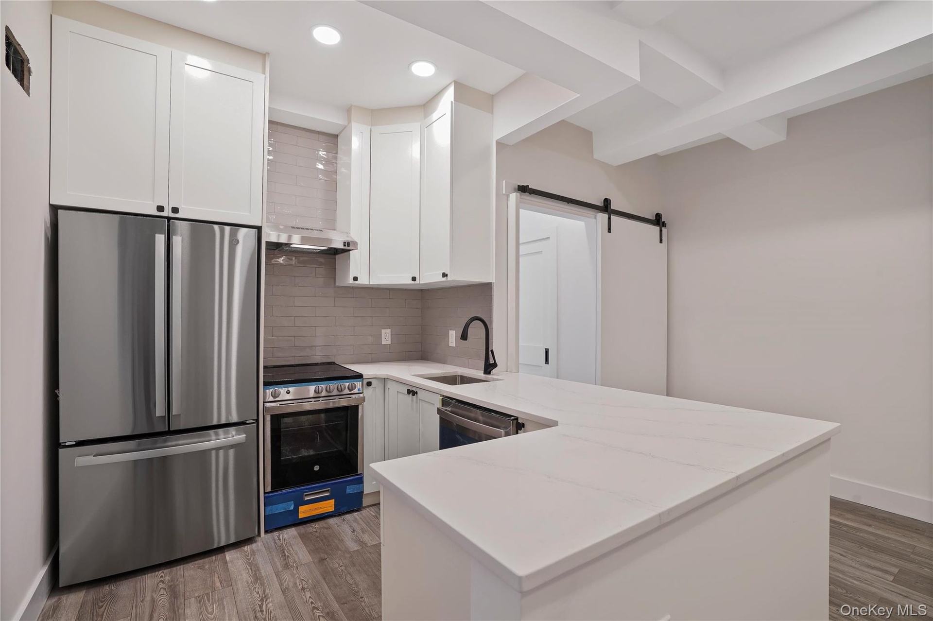 - Kitchen with stainless steel appliances, a barn door, white cabinetry, backsplash, and light wood-style floors