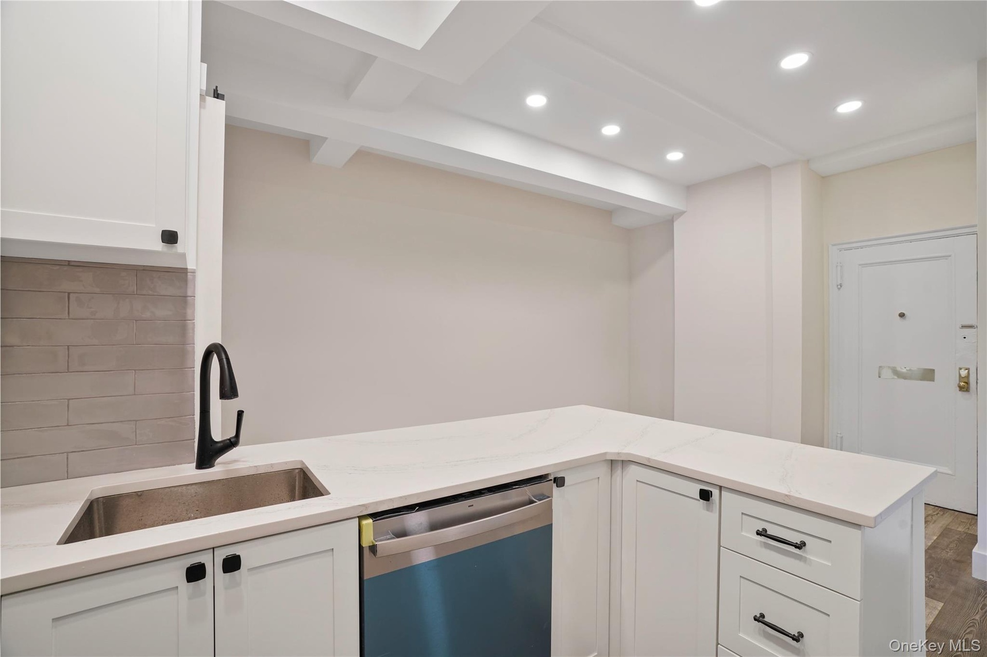 - Kitchen with light stone countertops, white cabinets, dishwashing machine, recessed lighting, and tasteful backsplash