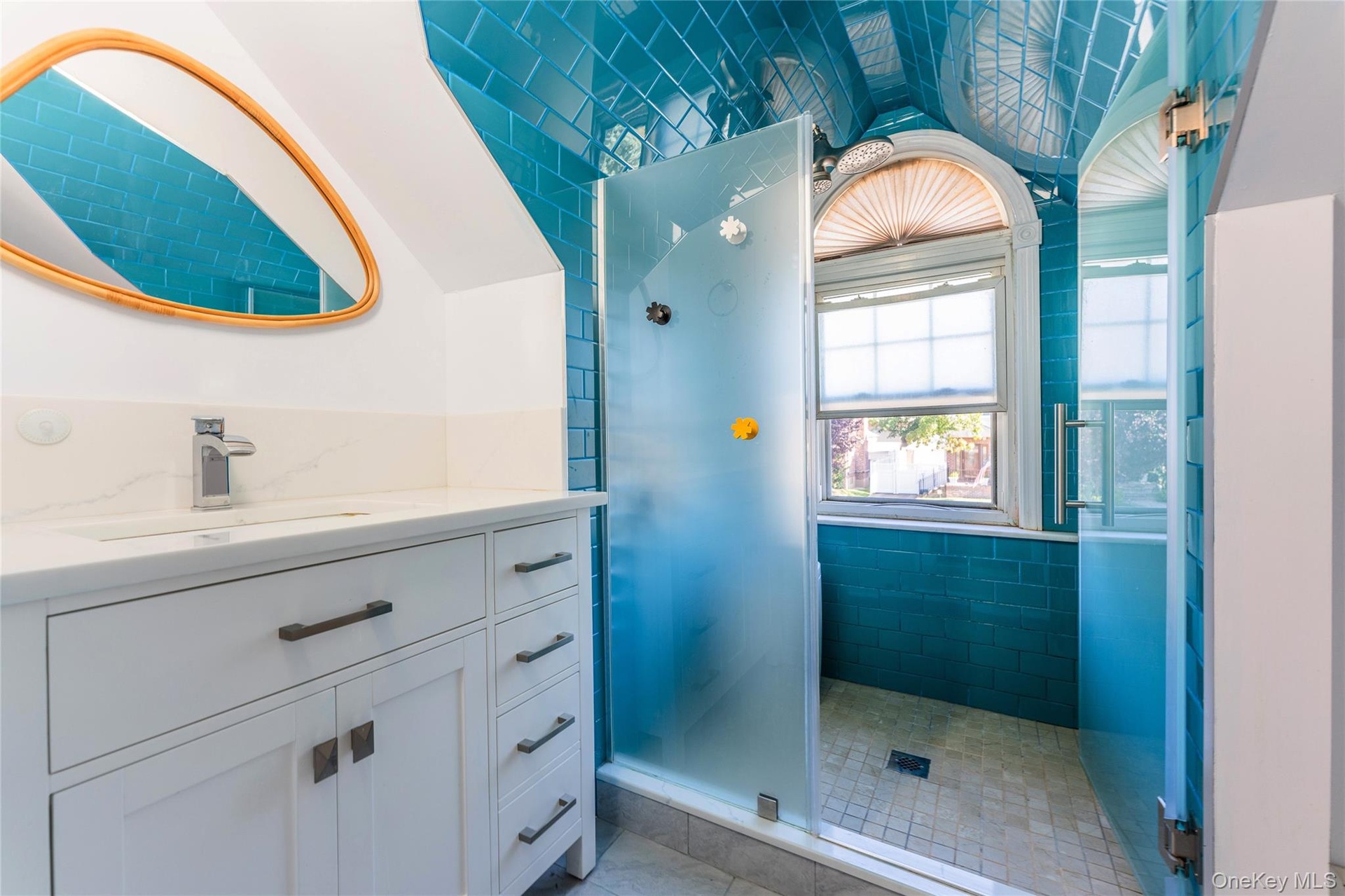 - Bathroom featuring tile walls, vanity, a stall shower, plenty of natural light, and a wainscoted wall