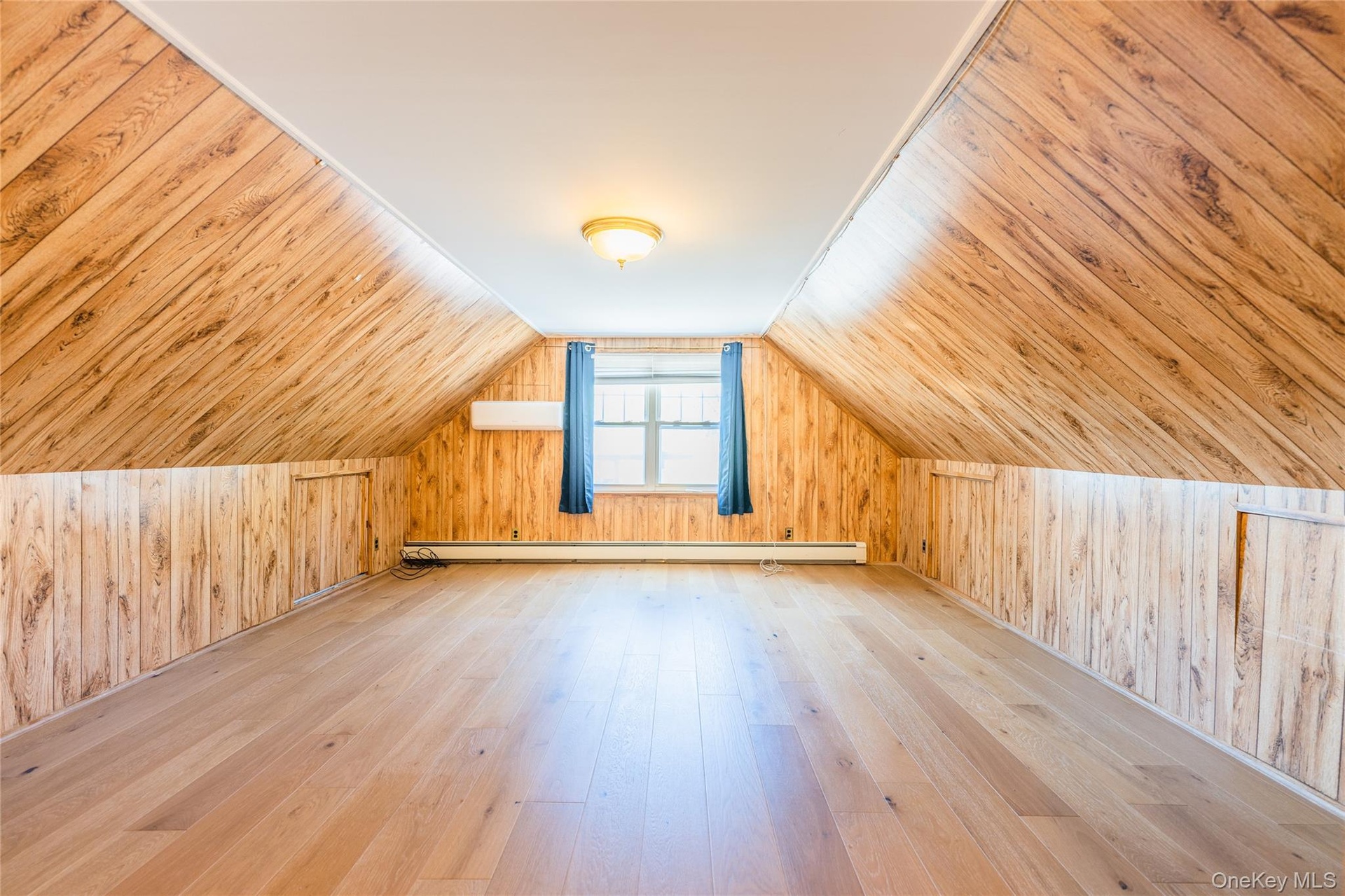 - Bonus room with light wood-style floors, lofted ceiling, a wall mounted AC, and a baseboard radiator