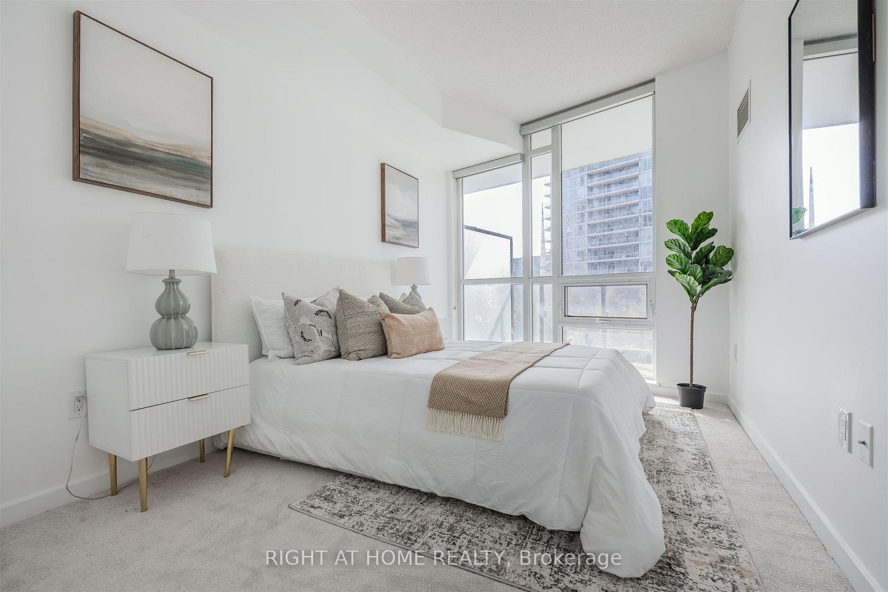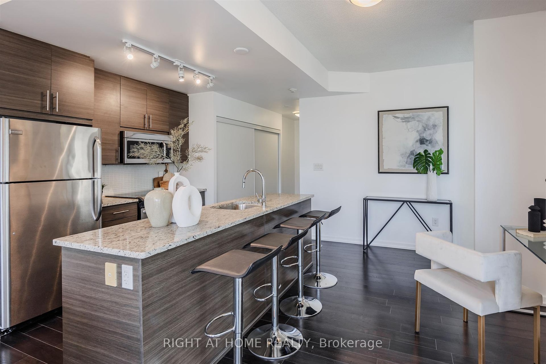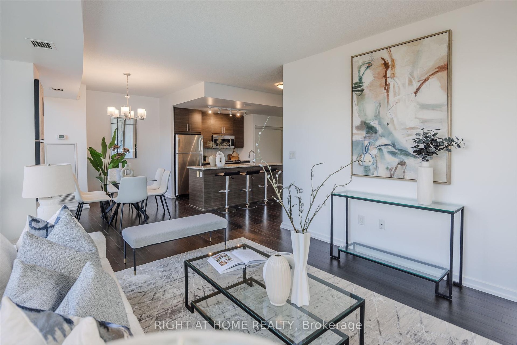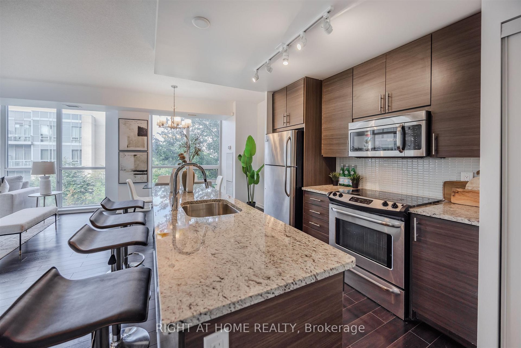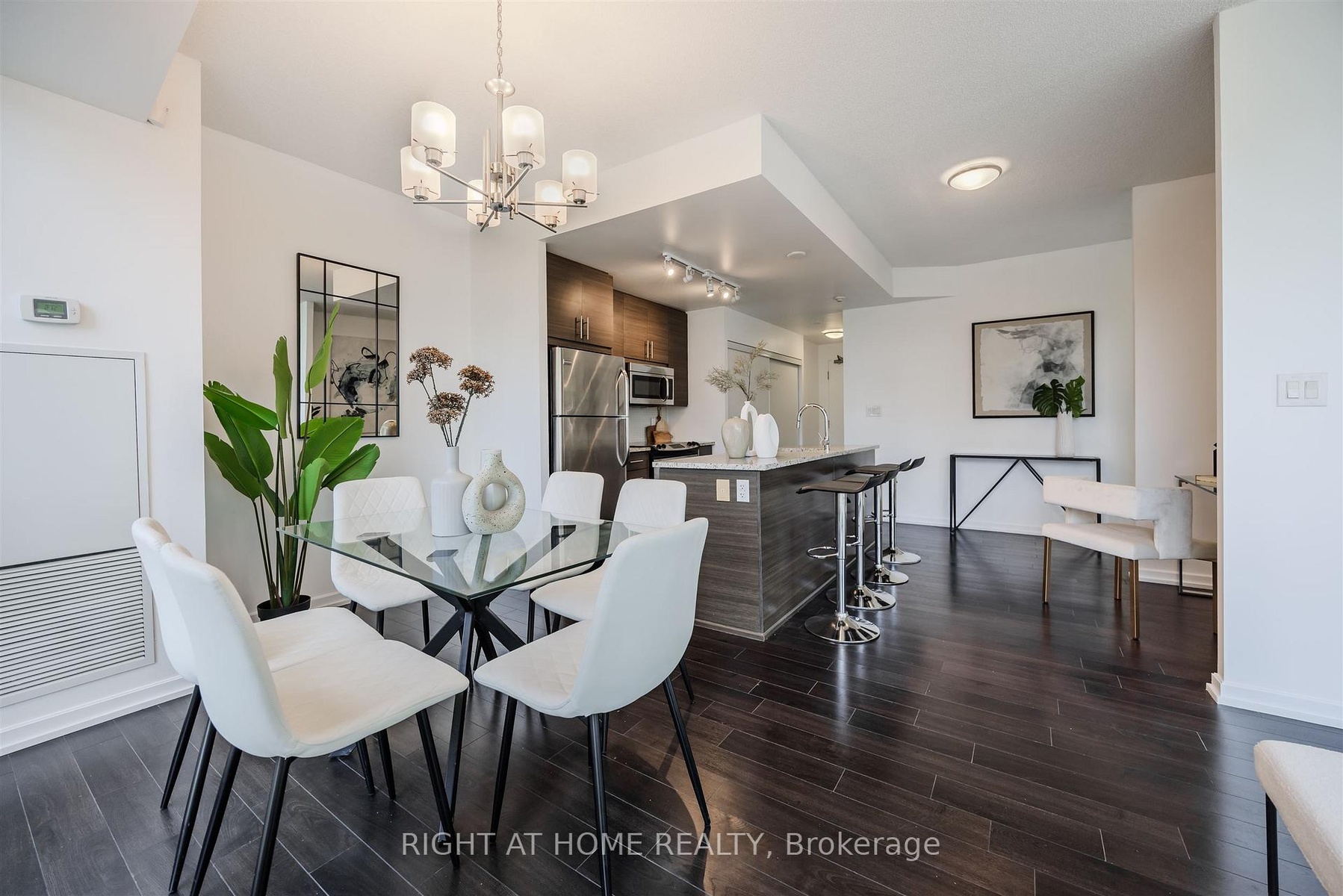 *Don Mills Station At Your Doorstep* Welcome to an exquisite luxury condo, nestled in the prestigious Emerald City Community. This stylish residence offers more than 1000 square feet of living space, and blends modern sophistication with timeless charm, creating a truly elevated living experience. Upon entry, you're welcomed into a freshly painted interior featuring a sun-filled open-concept living and dining area with gleaming floors, soaring 9 foot ceilings, elegant light fixtures, and floor to ceiling windows. The chef-inspired kitchen is equipped with premium stainless steel appliances, granite countertops, a custom backsplash, generous cabinetry, and a convenient centre island. The expansive primary bedroom offers a walk in closet and a four piece ensuite. Enjoy a spacious 177 square foot balcony overlooking the serene courtyard and plush greenery, plus the convenience of one parking space and one locker. At Emerald City, residents benefit from an array of upscale amenities including a cutting-edge fitness center, swimming pool, hot tub, party room, games room, and 24-hour concierge service. Move right in and start enjoying the lifestyle you deserve! The home is conveniently located next to shops, dining, great schools, highways 401 and 404/DVP, and public transportation including Don Mills Subway Station at your doorstep, providing the ultimate in urban living.