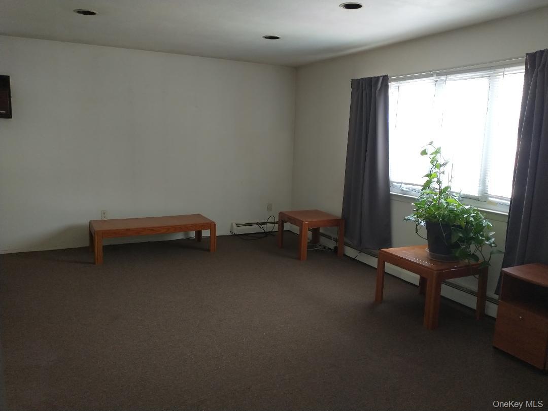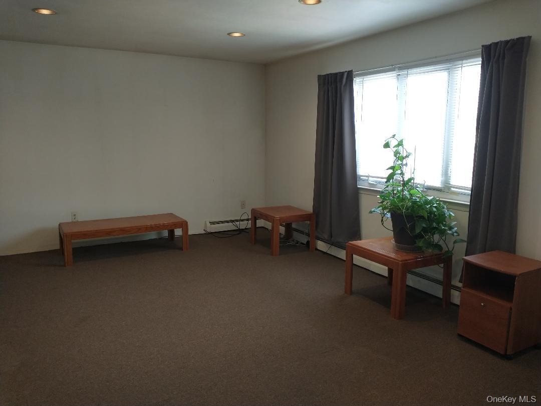 - Living area with carpet flooring, baseboard heating, and recessed lighting