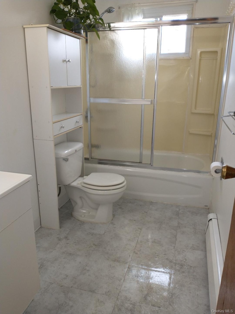 - Full bath featuring shower / bath combination with glass door, vanity, a baseboard heating unit, and light tile patterned flooring