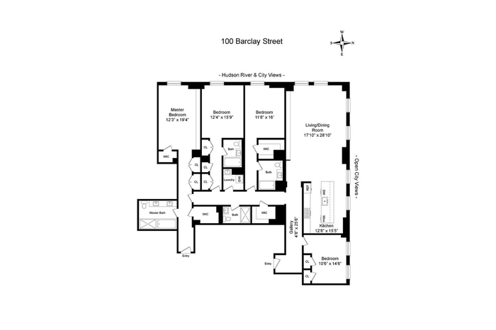 Triple Mint, Newly Renovated, and Just Listed, Residence B22 presents a rare opportunity to own one of the most sought-after 4-bedroom, 4-bath lofts at the iconic One Hundred Barclay. Perched high on the 22nd floor and bathed in natural light, this 2,870-square-foot masterpiece blends timeless elegance with modern sophistication. Grand 10-foot ceilings, oversized 7-foot casement windows, and 4-inch wide-plank white oak floors set the tone for airy, expansive living, while panoramic northwest views capture the majesty of the Manhattan skyline and the shimmering Hudson River beyond.