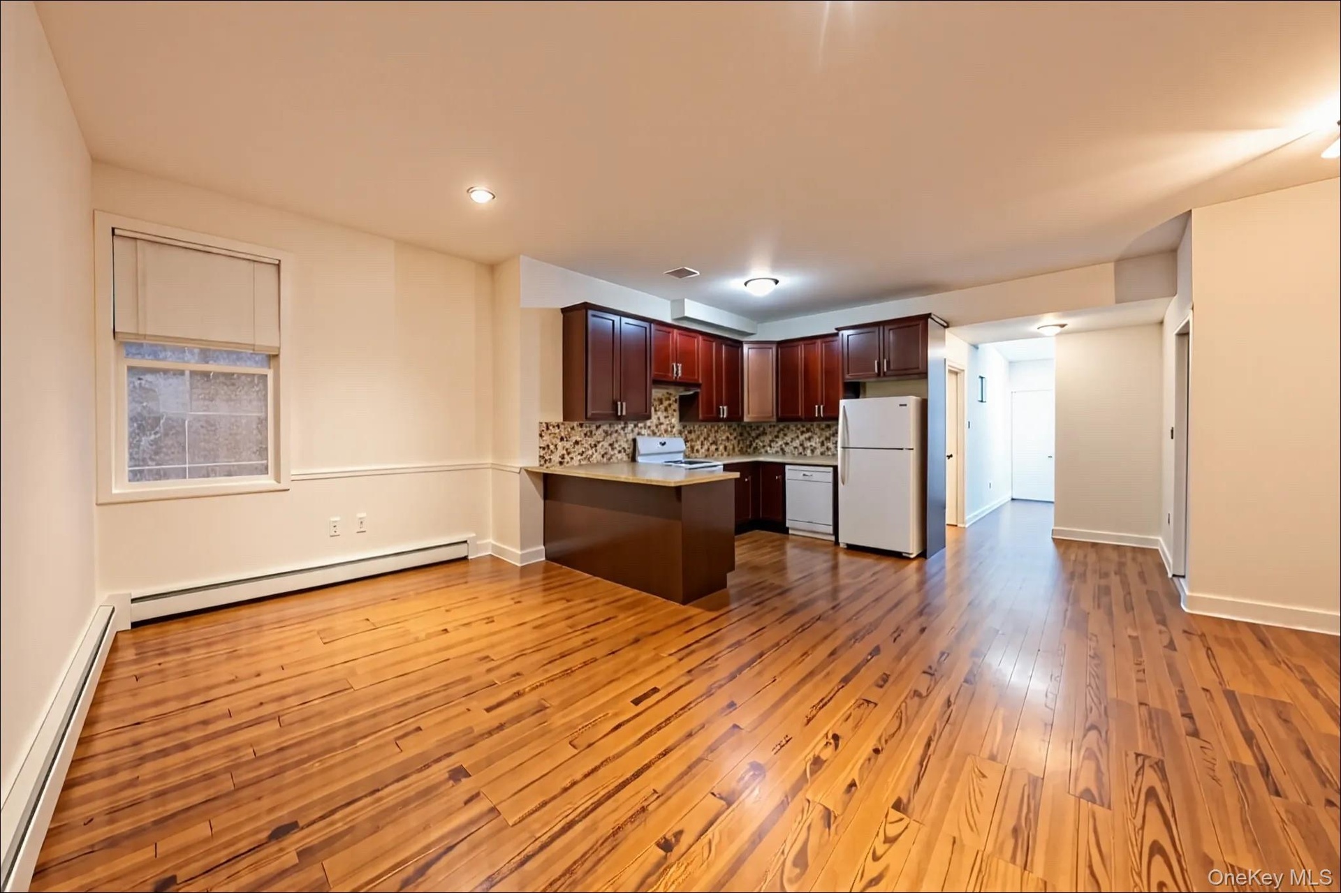 - Living area featuring recessed lighting, wood finished floors, and a baseboard heating unit