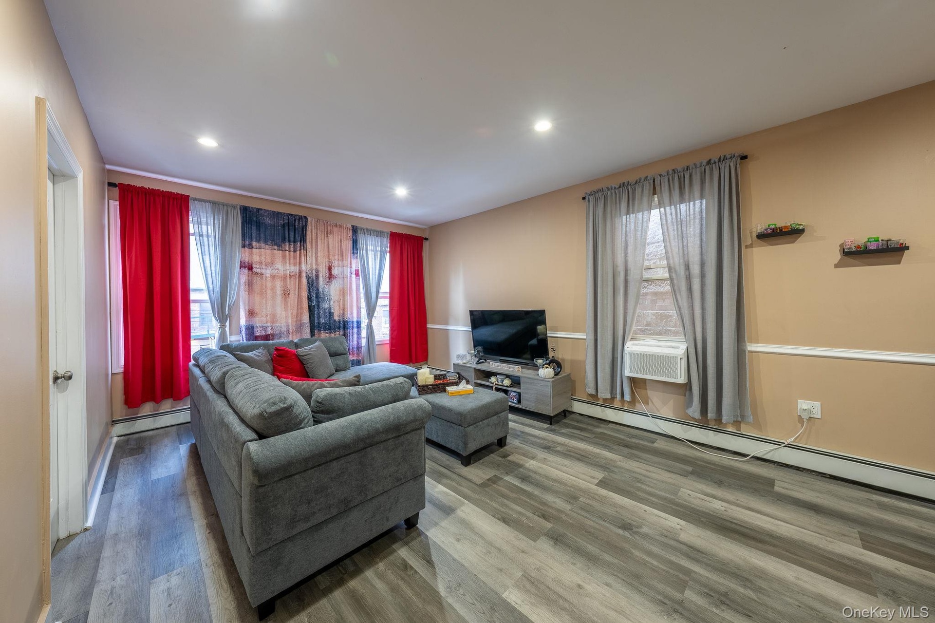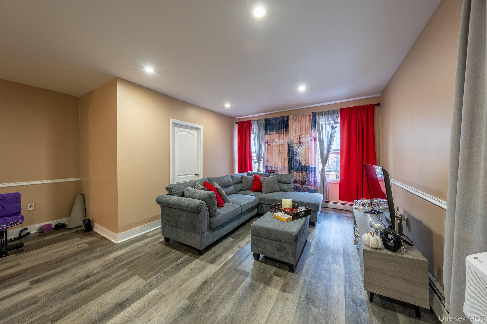 - Living room with wood finished floors, a baseboard heating unit, and recessed lighting